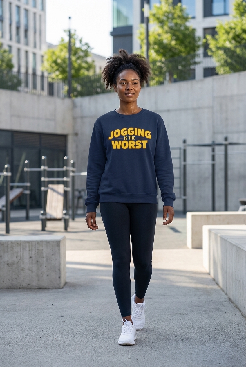 The phrase "Jogging Is The Worst" is a humorous exaggeration reflecting a general dislike for running or intense cardio workouts. It taps into the relatable feeling of dreading exercise and finding humor in personal fitness struggles.