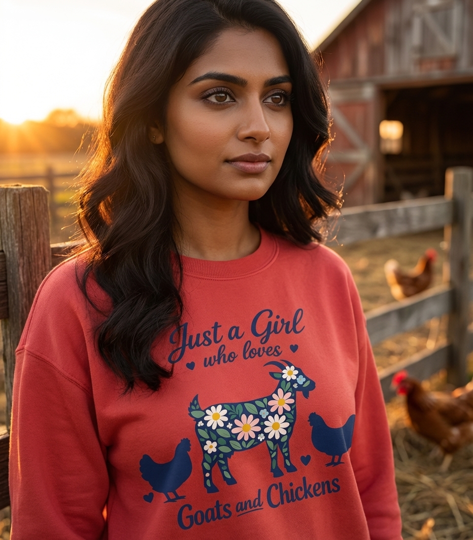 The 'Just a Girl Who Loves Goats and Chickens' design captures the lifestyle of passionate farm animal enthusiasts who cherish their barnyard friends, embrace rustic charm, and find joy in rural living.
