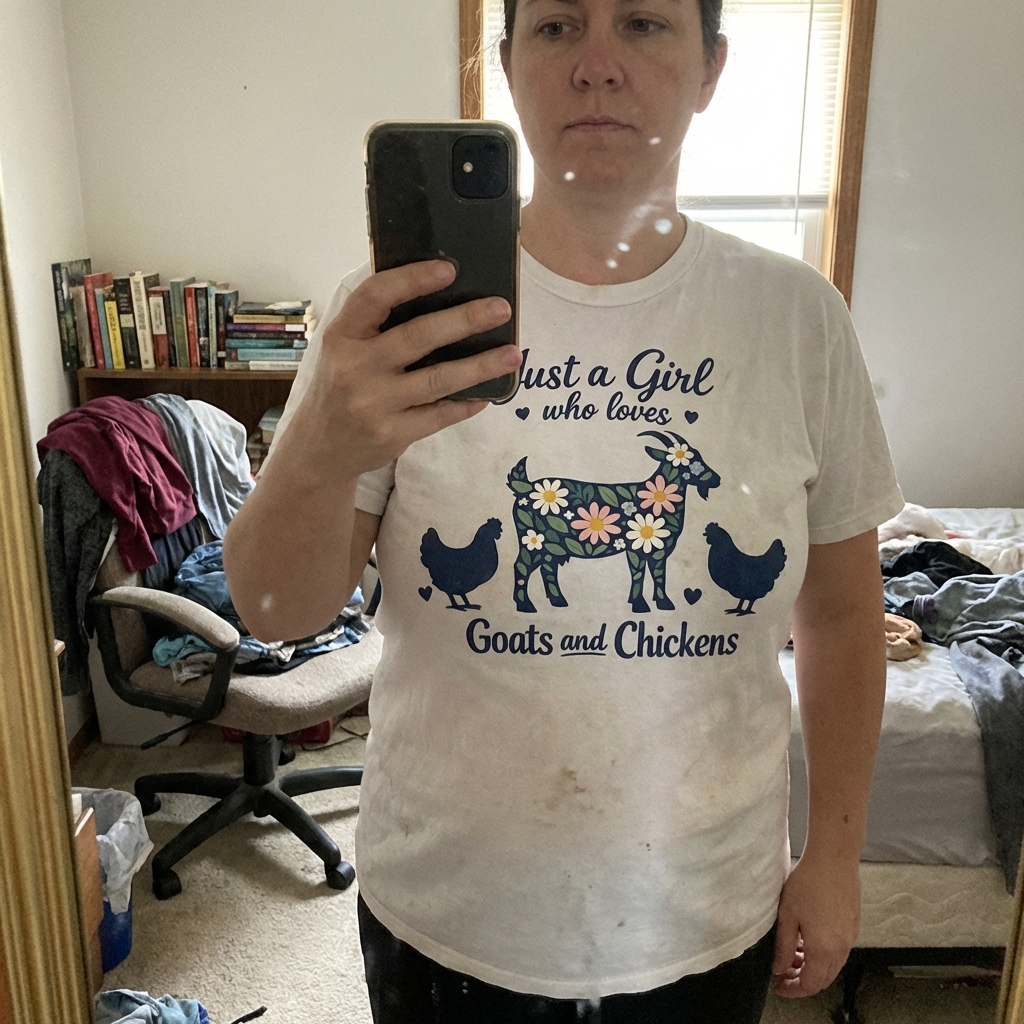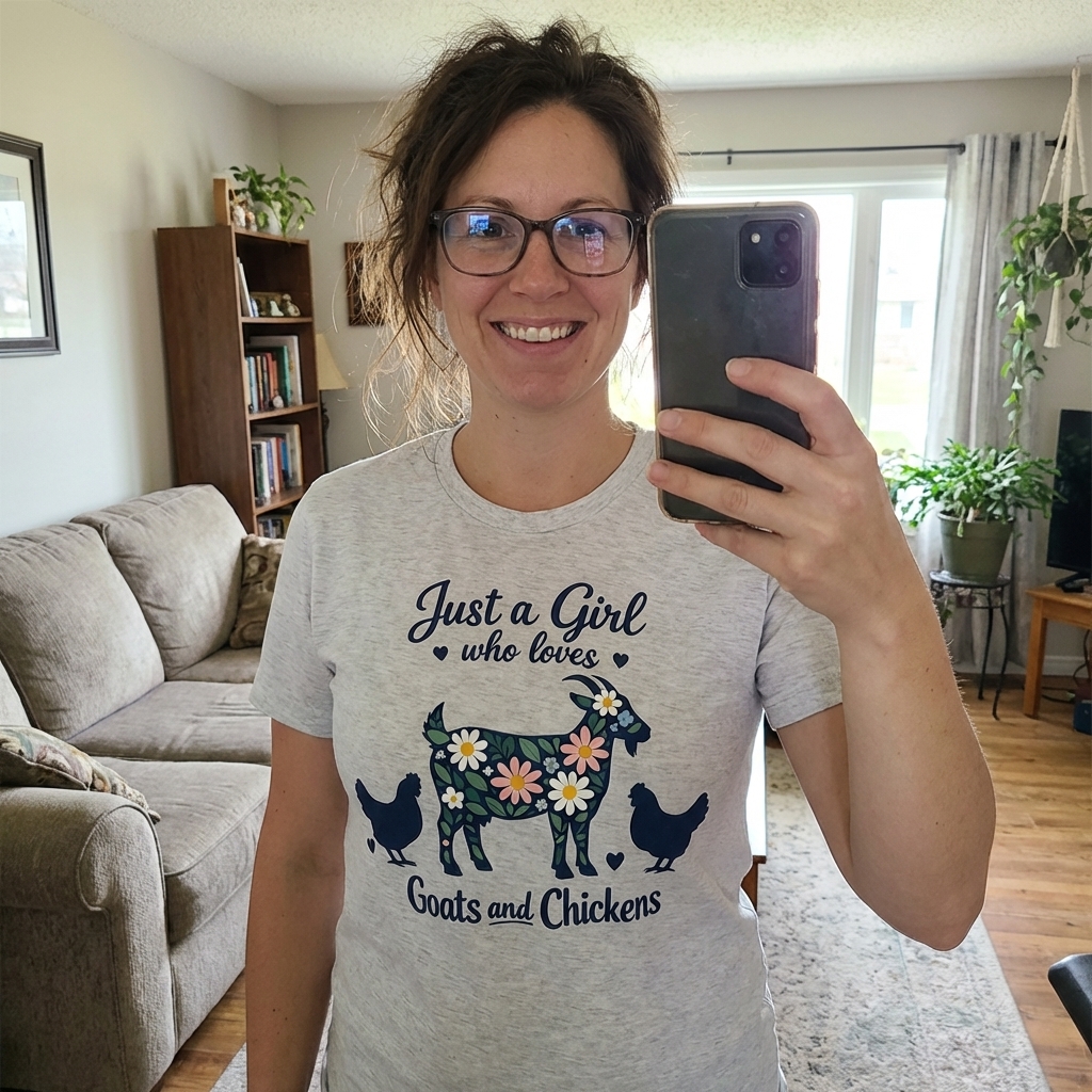 Oh my gosh, I just got this shirt and it's so perfect. The "Just a Girl Goats Chickens" design is exactly my aesthetic, and it's super comfy for just hanging out. Definitely a new favorite!