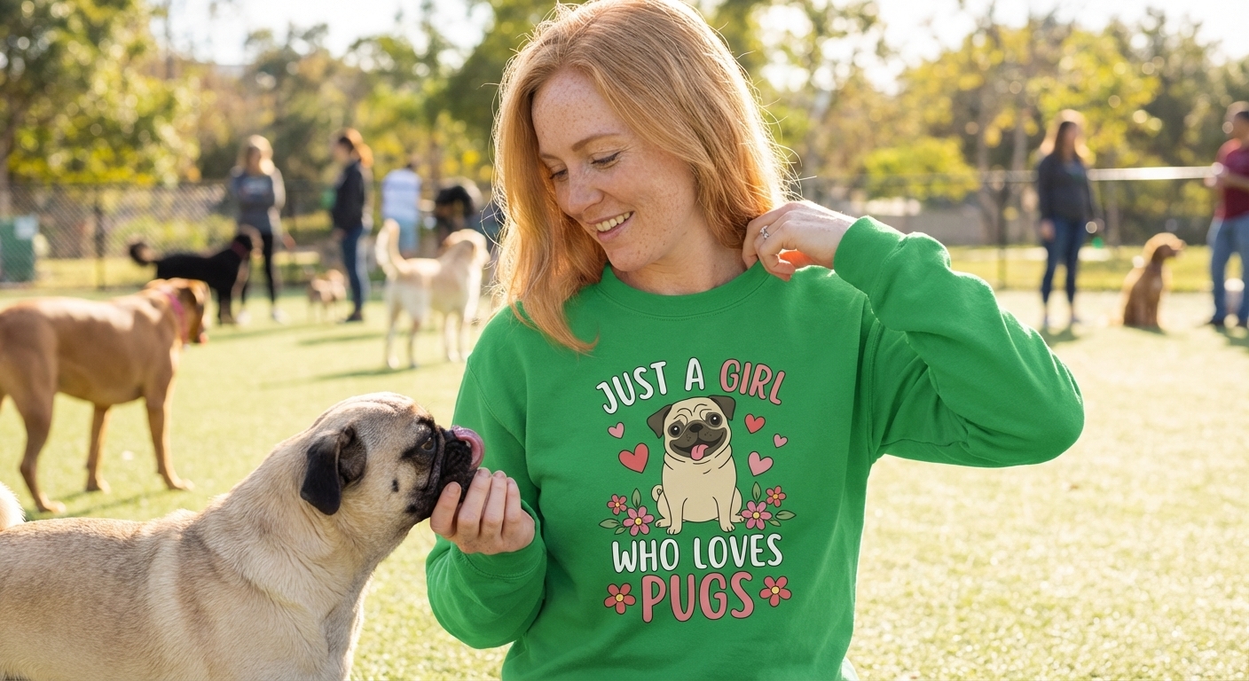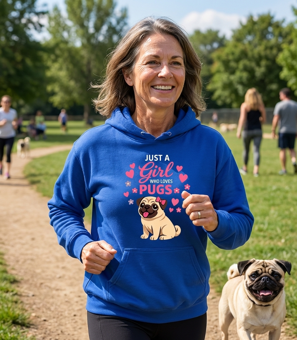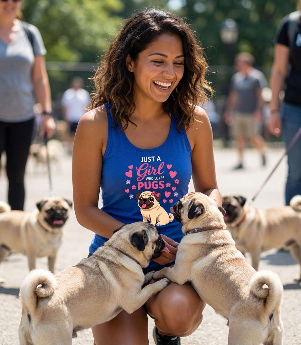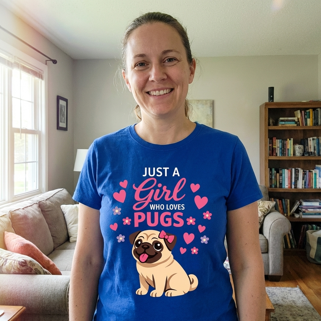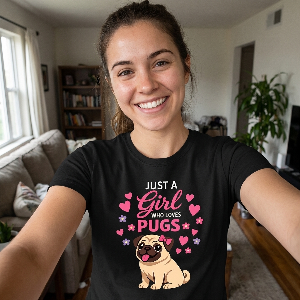 The "Just A Girl Who Loves Pugs" phrase captures the lifestyle of passionate pug owners who adore their wrinkly companions, celebrate their quirks, and show off their puppy love.