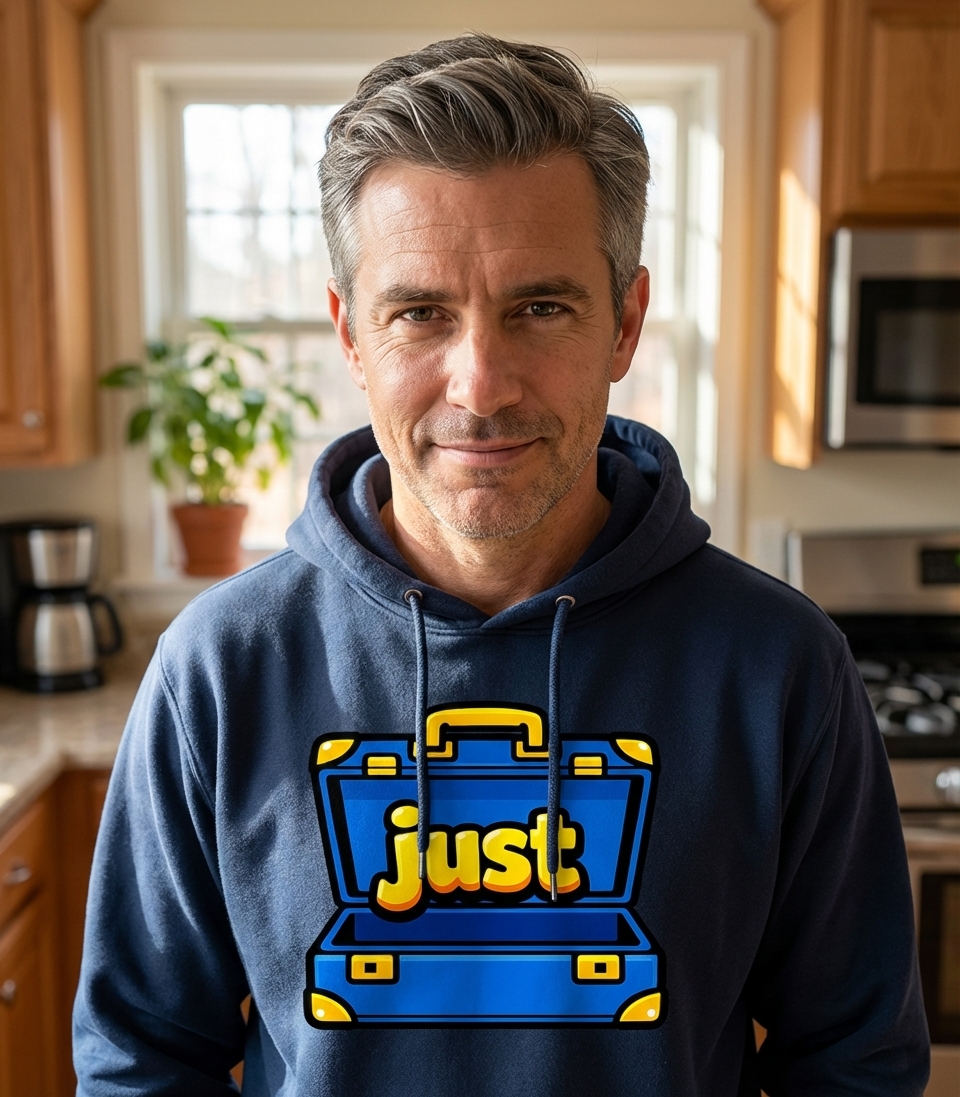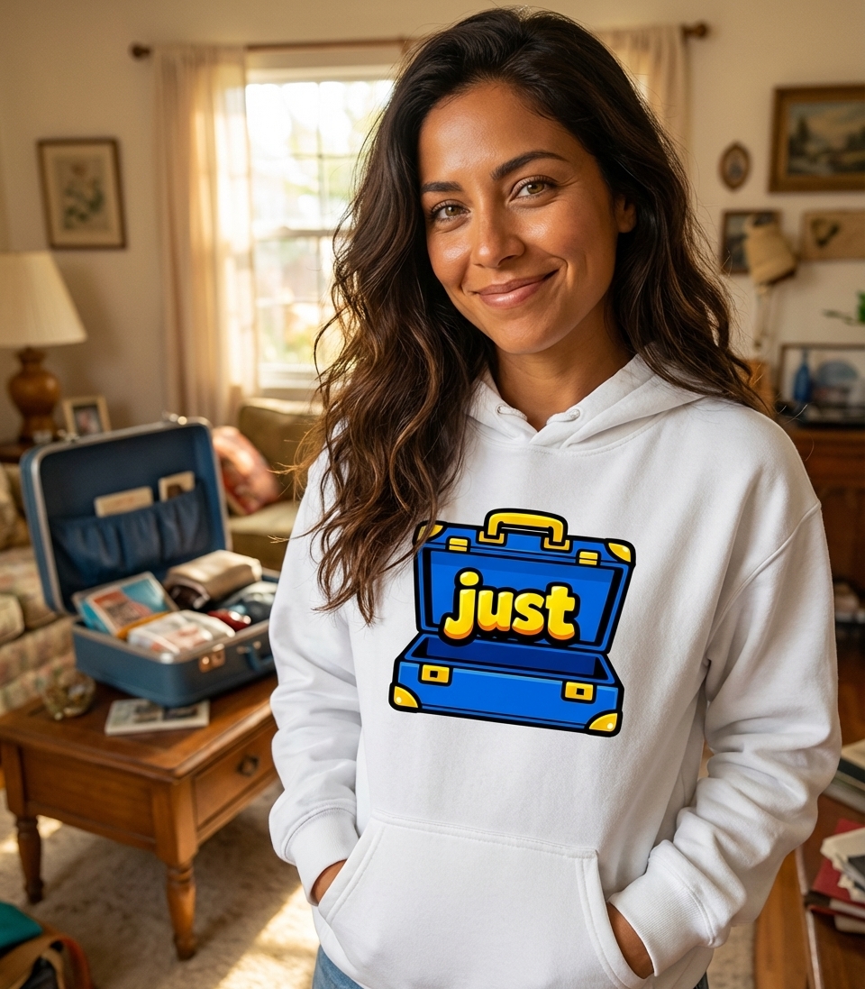 This unique t-shirt design features a vibrant blue open briefcase, humorously containing only the bright yellow, bubbly word "just." It's a playful visual representation of a well-known idiom, presented in a clean and eye-catching graphic style.