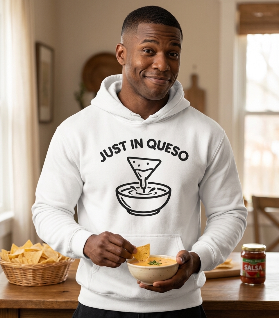 The "Just In Queso" phrase captures the lifestyle of fun-loving food enthusiasts who enjoy witty wordplay, delicious snacks, and good times.