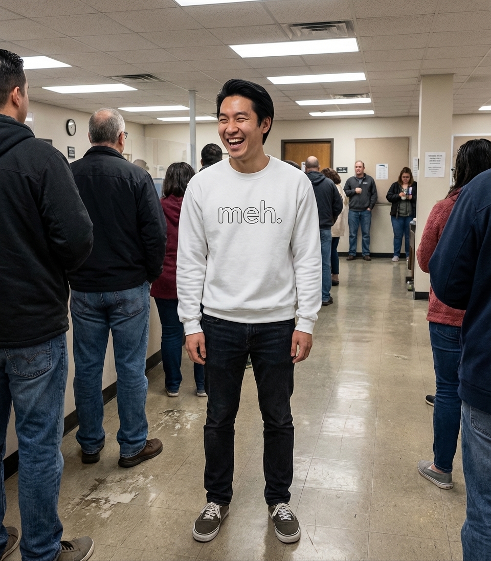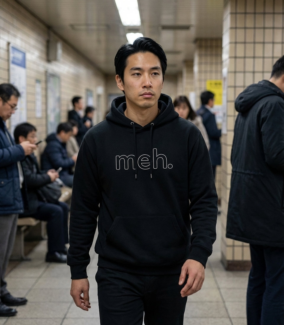 The "Meh" phrase captures the lifestyle of people who express their mild apathy, boredom, and general indifference with understated humor.