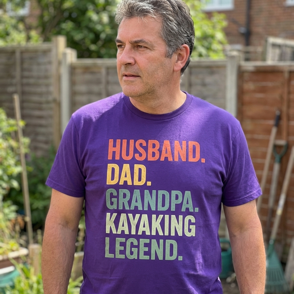 This design celebrates a man who embraces multiple important roles in life, culminating in his passion for kayaking. The stacked text and vintage color palette give it a classic, established feel, highlighting a journey through life's stages.