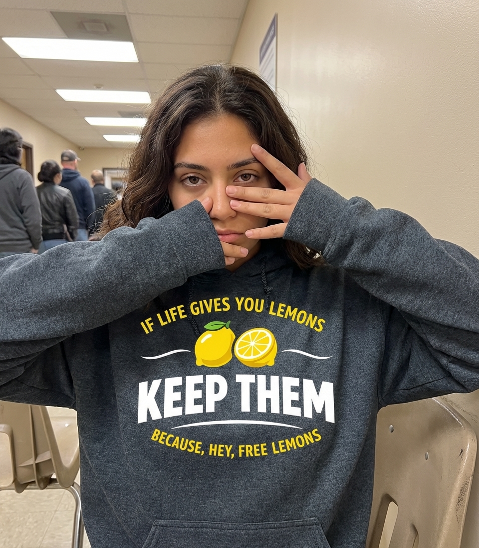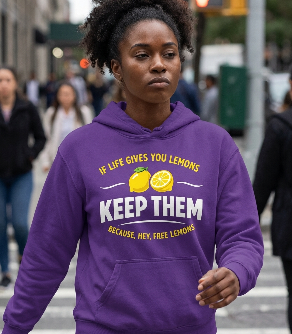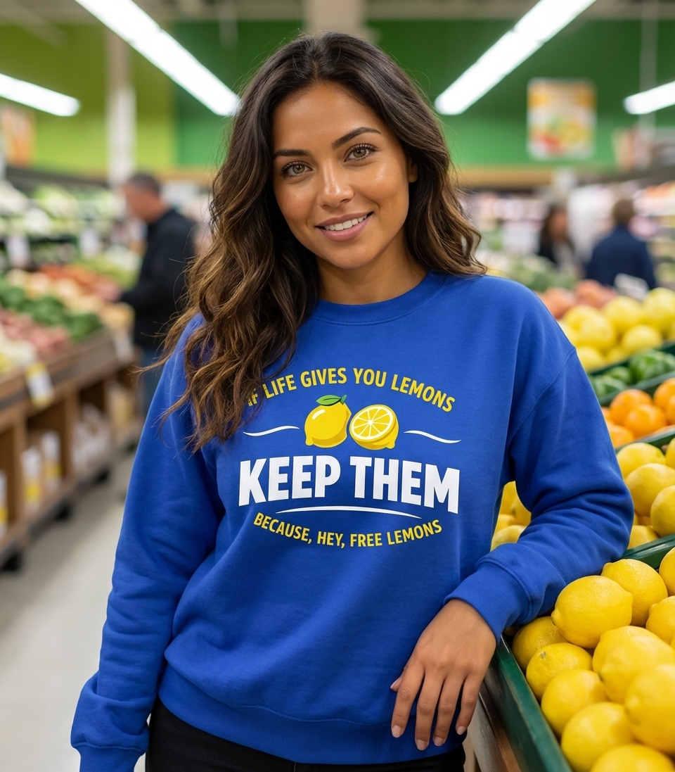 This design offers a clever and humorous twist on the classic adage, "If life gives you lemons, make lemonade." Instead, it suggests a more pragmatic and comically cynical approach: simply keep the free lemons.