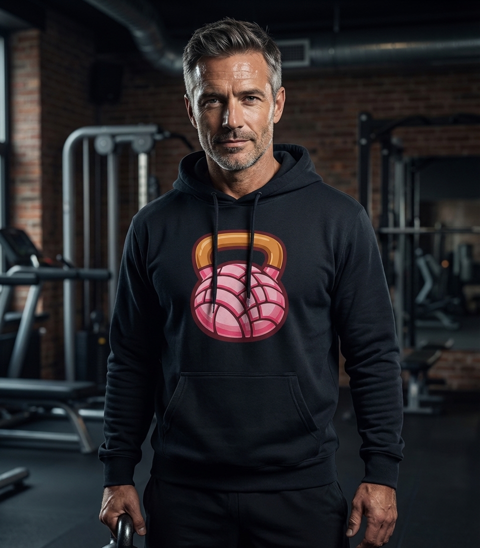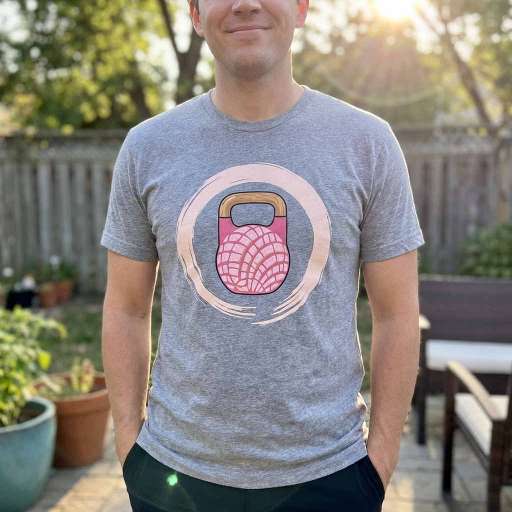 This unique t-shirt design features a creative fusion: a classic kettlebell reimagined as a beloved Mexican concha. The vibrant pink hues and distinctive shell-like pattern of the sweet bread are playfully integrated into the fitness equipment.