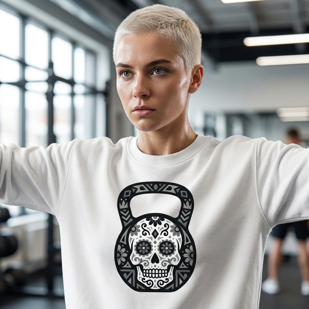 The Kettlebell Sugar Skull Crewneck Sweatshirt is an exclusive piece that showcases Fitness spirit with artistic flair.