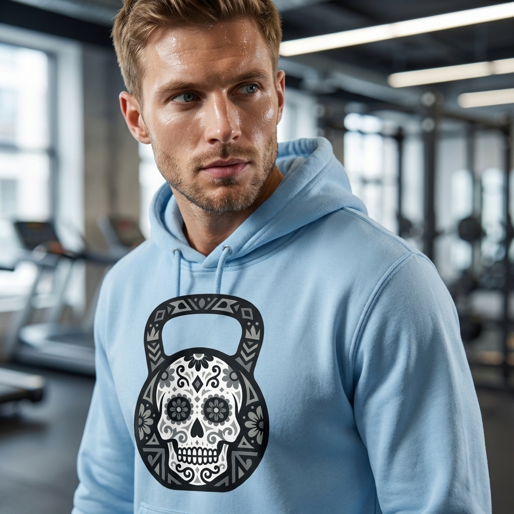 Elevate your Fitness collection with Kettlebell Sugar Skull on a Crewneck Sweatshirt! This unique graphic features a kettlebell adorned with intricate sugar skull detailing, blending fitness with traditional folk art. Perfect for those who love gym culture and celebrate life.
