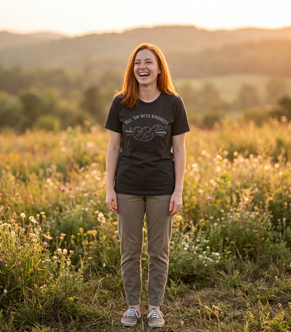 The "Kill 'Em With Kindness" phrase captures the lifestyle of empathetic individuals who advocate for positive interactions, defuse conflict, and inspire generosity.