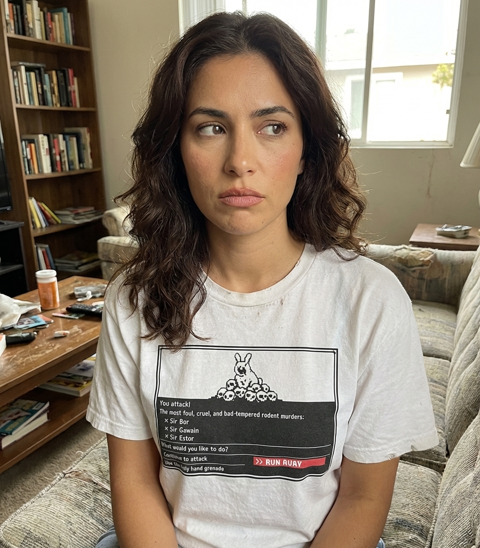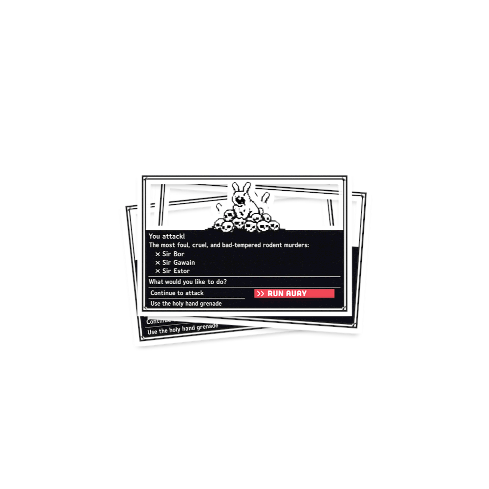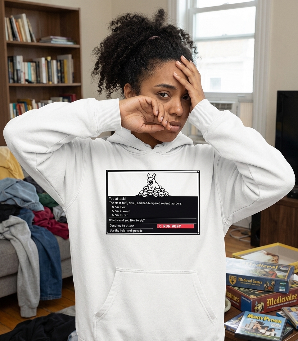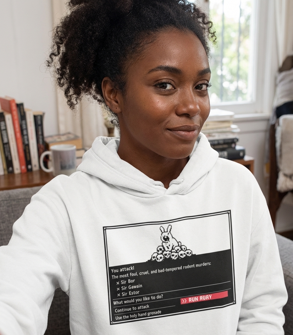 This design celebrates the legendary Killer Rabbit of Caerbannog, delighting fans of classic British comedy and retro gaming scenarios.