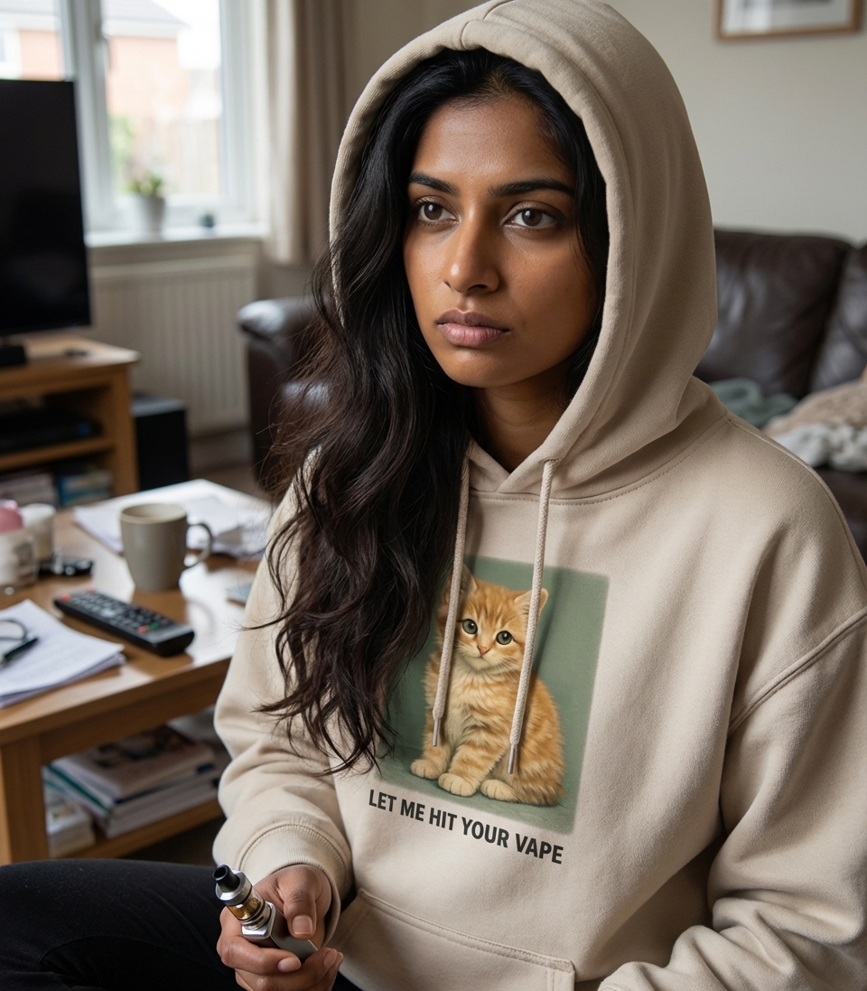 The 'Let Me Hit Your Vape' phrase captures the mischievous and playful spirit of cat enthusiasts who enjoy relatable internet humor and unexpected juxtapositions.