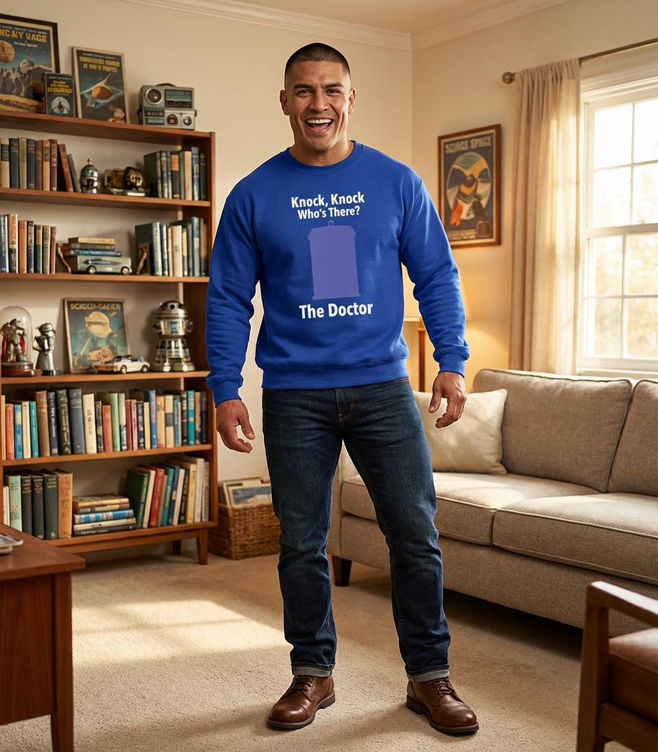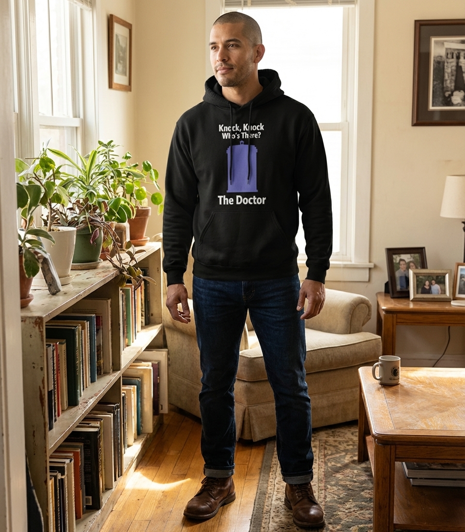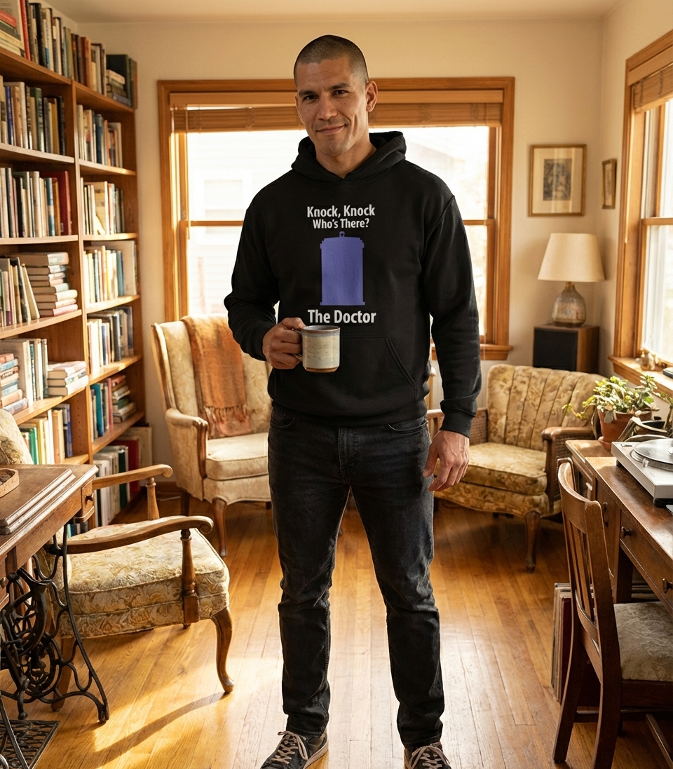 This minimalist graphic tee playfully presents a classic knock-knock joke with a sci-fi twist. The design centers around the instantly recognizable silhouette of the TARDIS, making it a subtle yet clear nod to one of television's most beloved series.