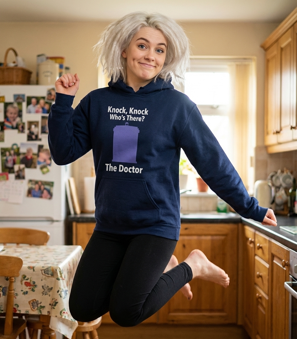 The phrase "Knock, Knock, Who's There? The Doctor" is a clever appropriation of a traditional joke format, directly referencing the titular character of the British science fiction show Doctor Who. It plays on the Doctor's mysterious and often unannounced arrival, always ready for a new adventure or to save the day.