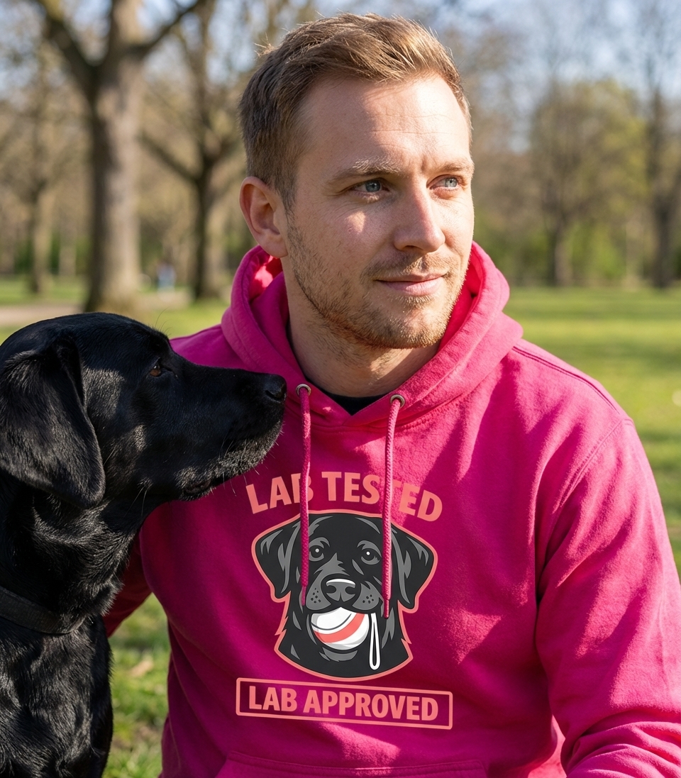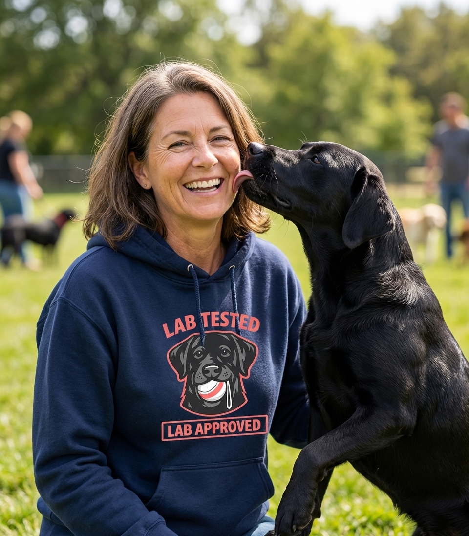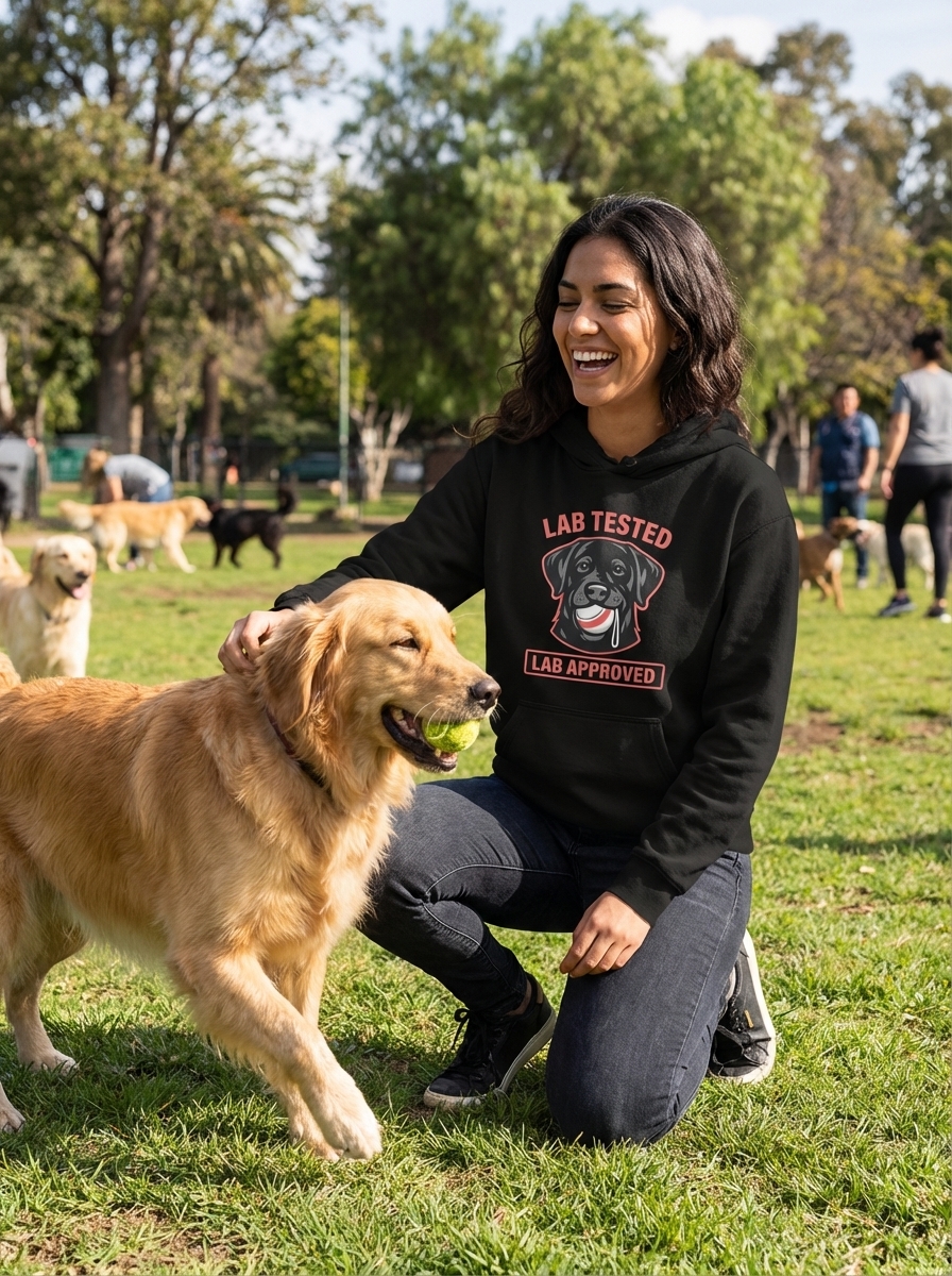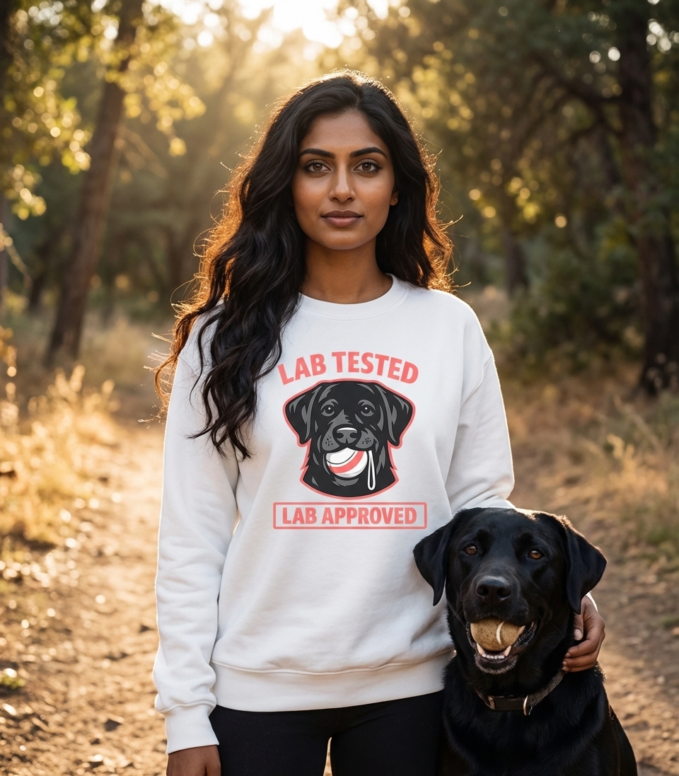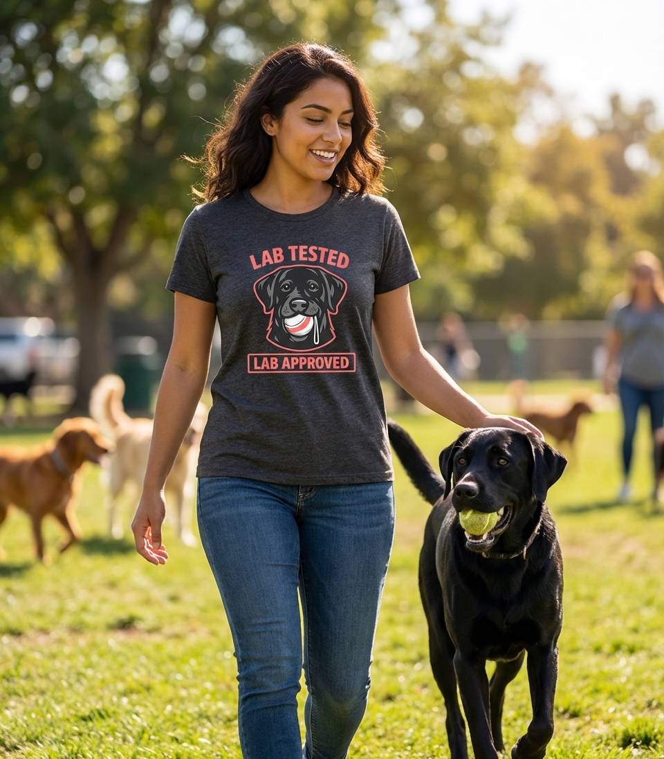 The 'Lab Tested Lab Approved' phrase playfully captures the lifestyle of passionate Labrador owners who enjoy their dog's boundless energy, playful nature, and unwavering loyalty.