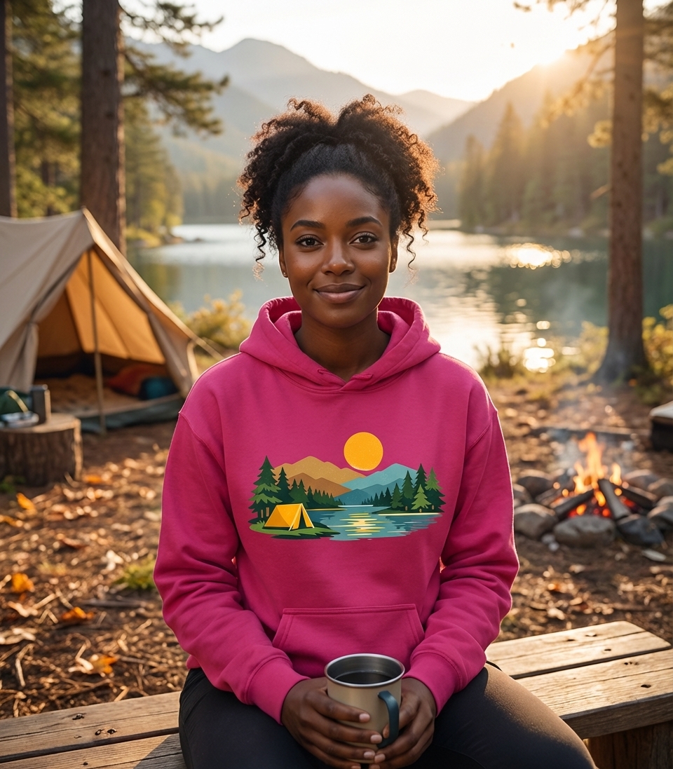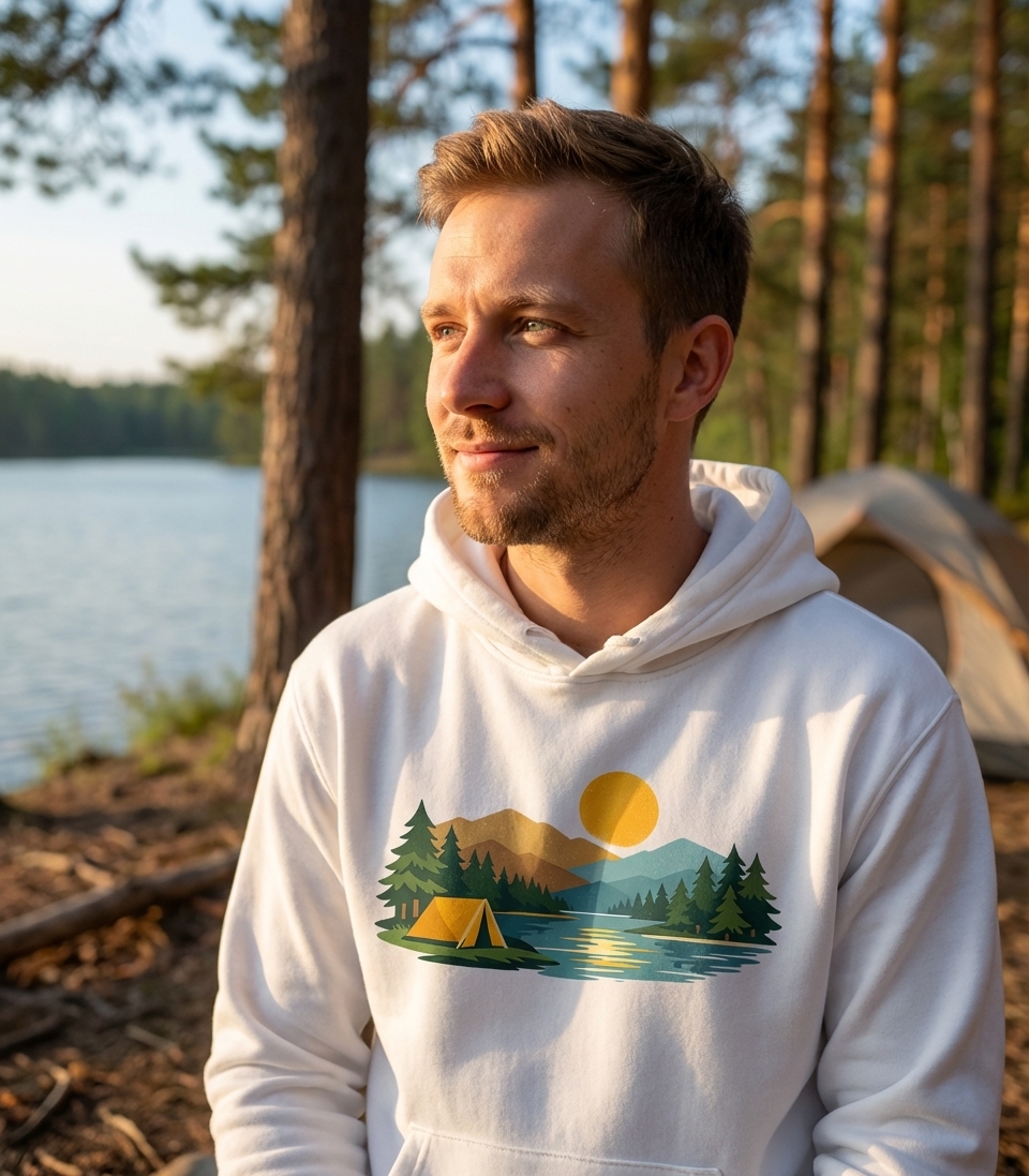 This serene design captures the lifestyle of passionate outdoor enthusiasts who spend their days exploring mountains, relaxing by lakes, and enjoying peaceful camping trips.