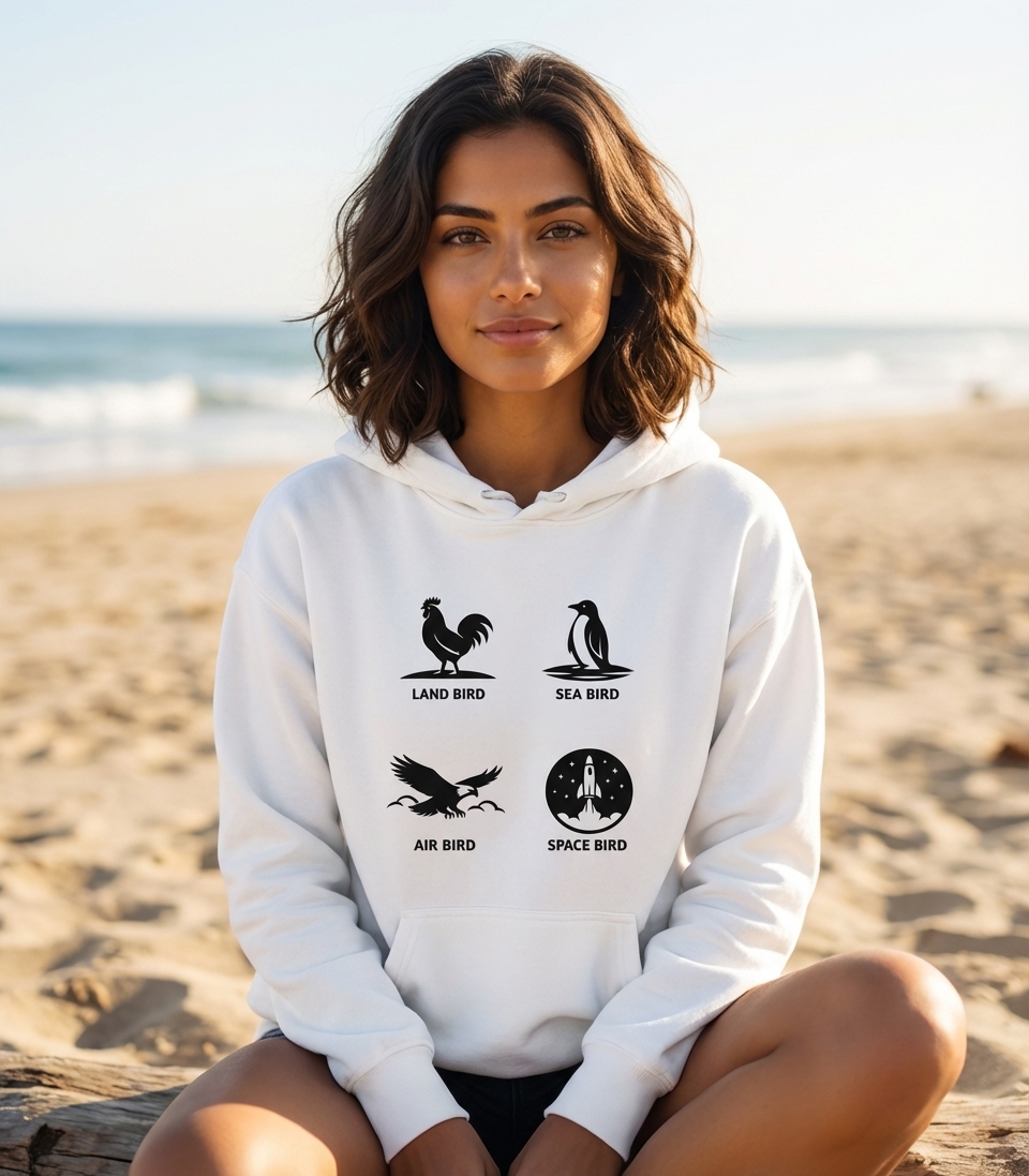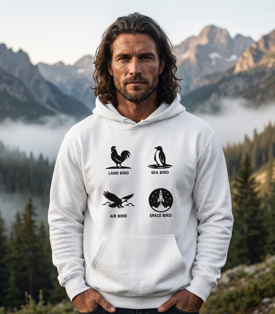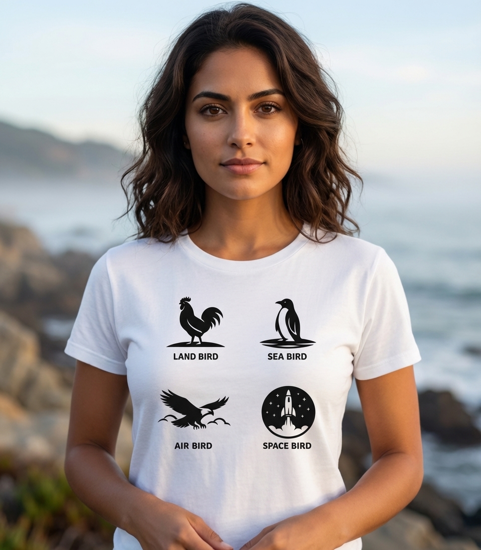 The phrases "Land Bird," "Sea Bird," and "Air Bird" denote traditional habitats for avian species. The inclusion of "Space Bird" with a rocket is a playful, metaphorical extension, humorously bridging ornithology with space exploration.