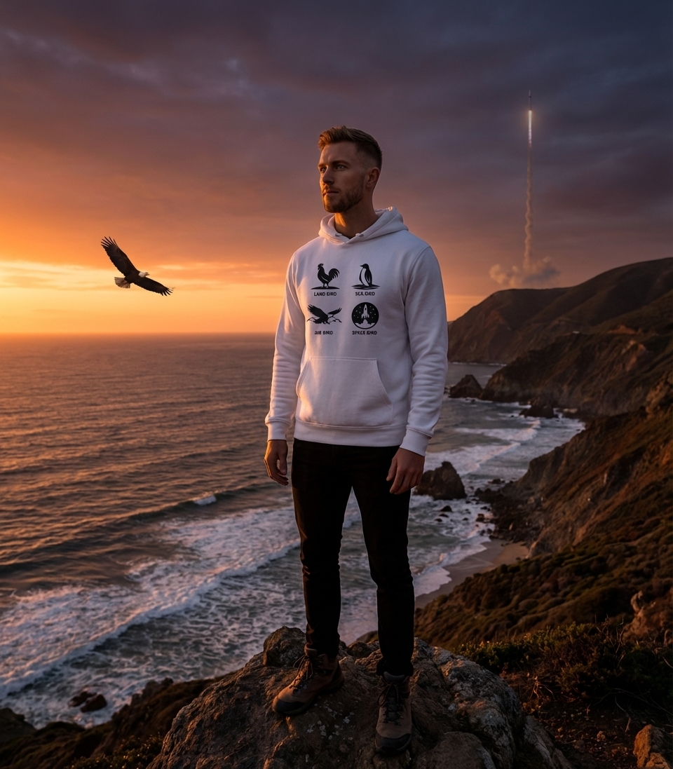 The 'Land Sea Air Space Birds' design playfully categorizes birds and rockets, capturing the clever humor of those who see unexpected connections.