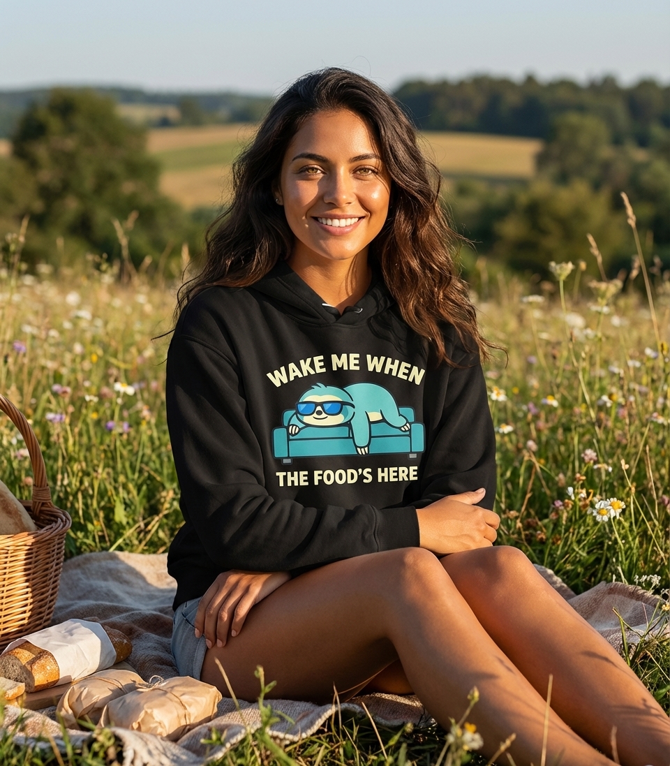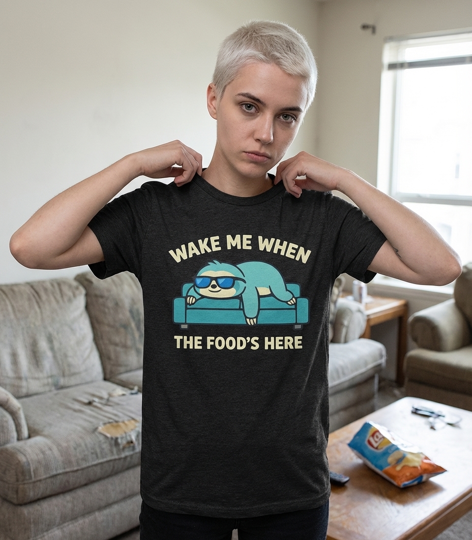 The "Wake Me When The Food's Here" phrase captures the lifestyle of passionate foodies and lazy individuals who enjoy relaxing, napping, and eagerly anticipating their next meal.