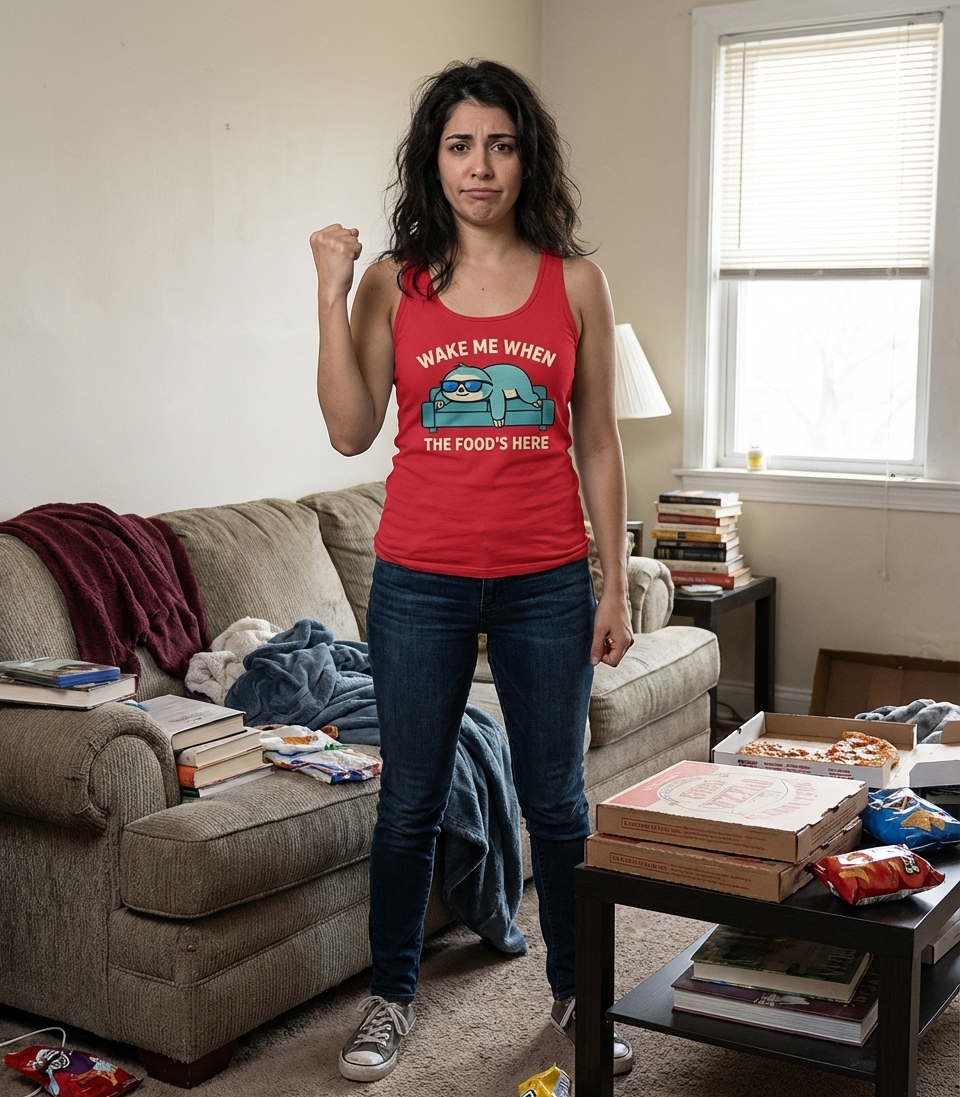 The core phrase, "Wake me when the food's here," is a playful expression of extreme relaxation and a deep love for food. It encapsulates the feeling of being so comfortable and at ease that the only thing worth interrupting a peaceful moment for is the arrival of a delicious meal.