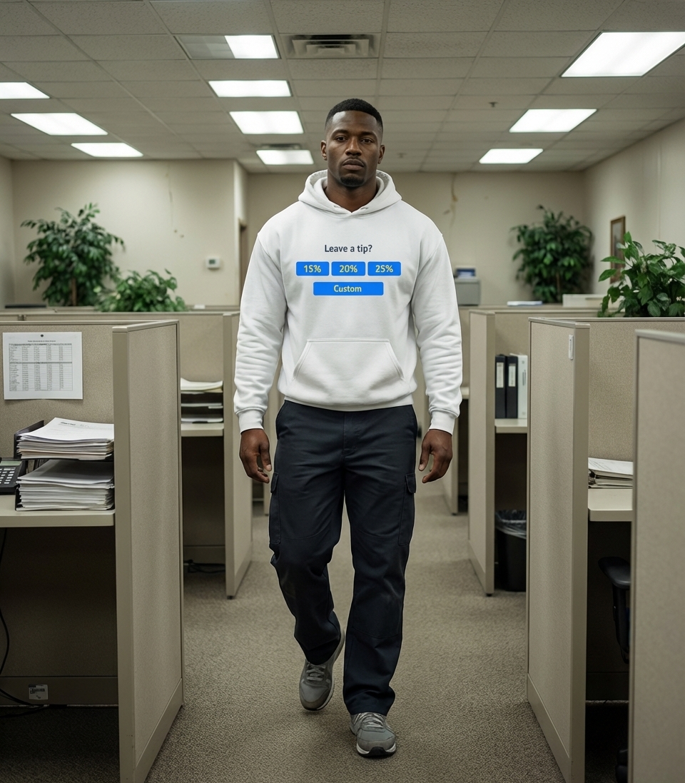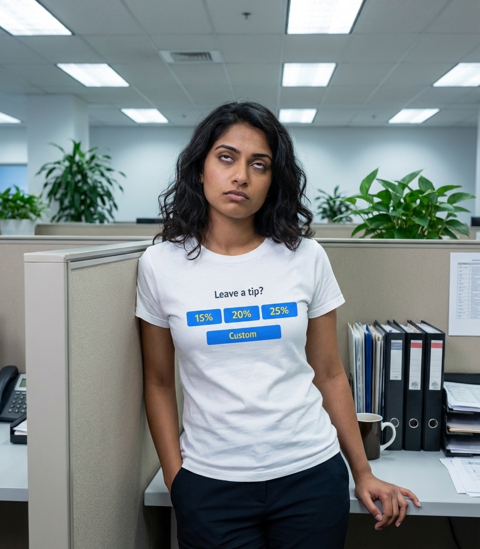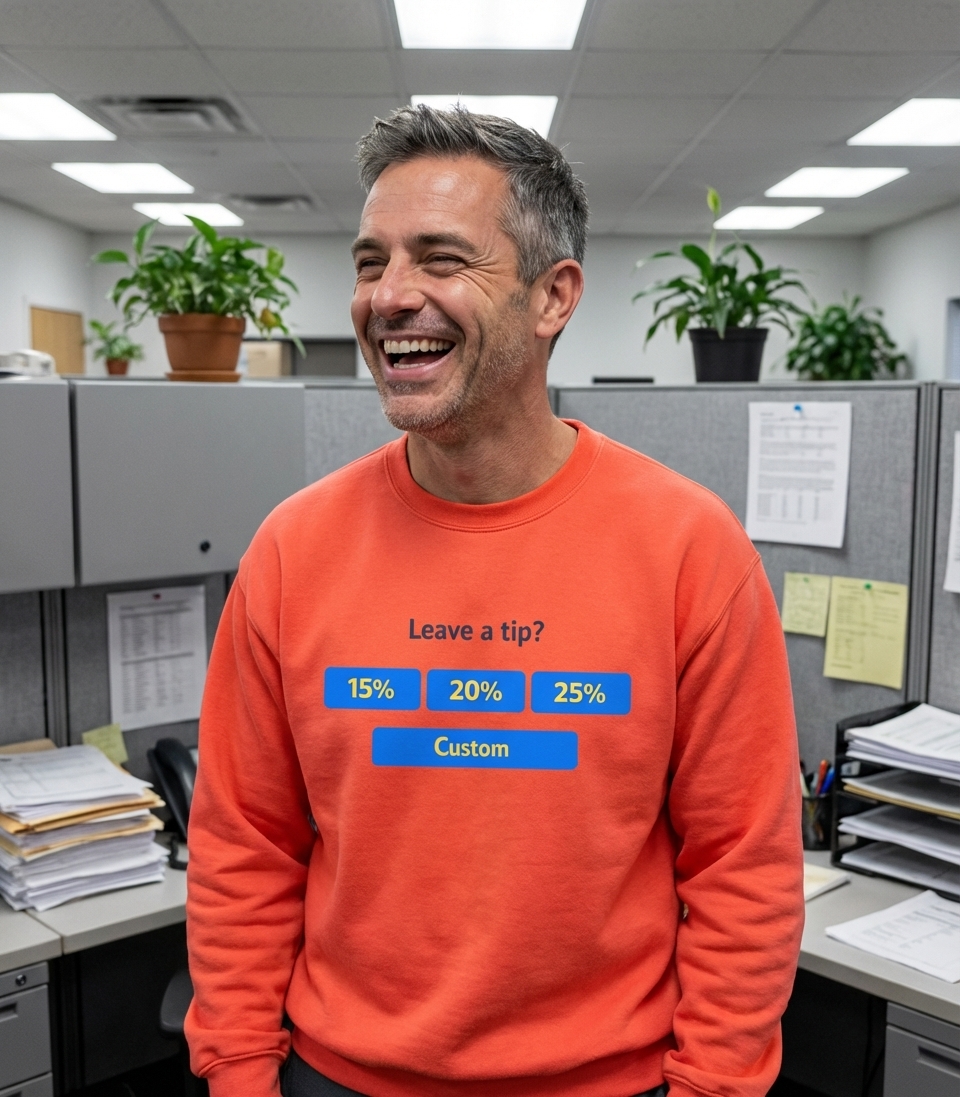 This unique t-shirt design visually reproduces a common digital payment interface, familiar to anyone who's dined out or received service recently. It showcases the question "Leave a tip?" accompanied by clear buttons for suggested gratuity percentages and a custom option.