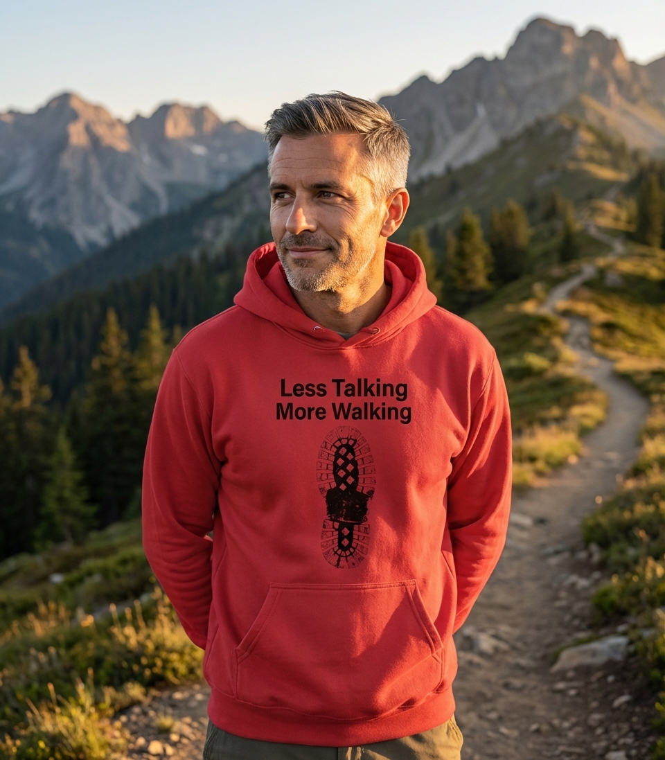 The 'Less Talking More Walking' phrase captures the active spirit of hikers who embrace trails, explore nature, and prioritize movement.