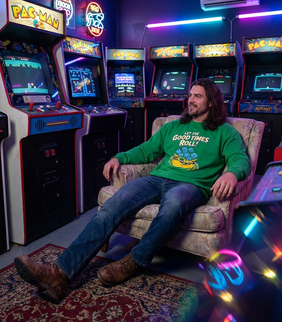 The 'Let The Good Times Roll!' phrase captures the lifestyle of passionate tabletop adventurers who spend their nights exploring dungeons, battling monsters, and sharing laughs with friends.