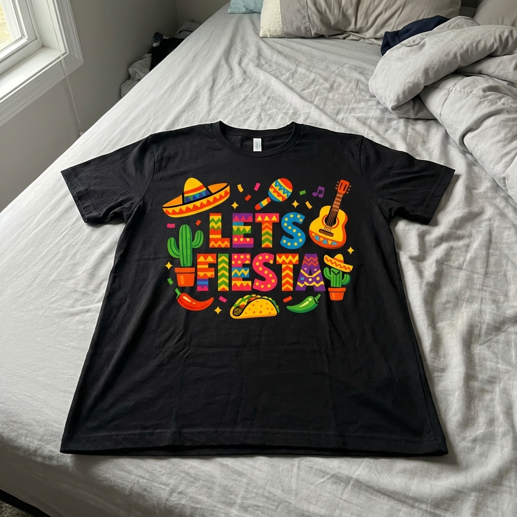 Okay, this 'Let's Fiesta Fun' shirt is pretty awesome. The abstract design really pops without being too much, and it's surprisingly soft too – definitely a good pickup for casual days.