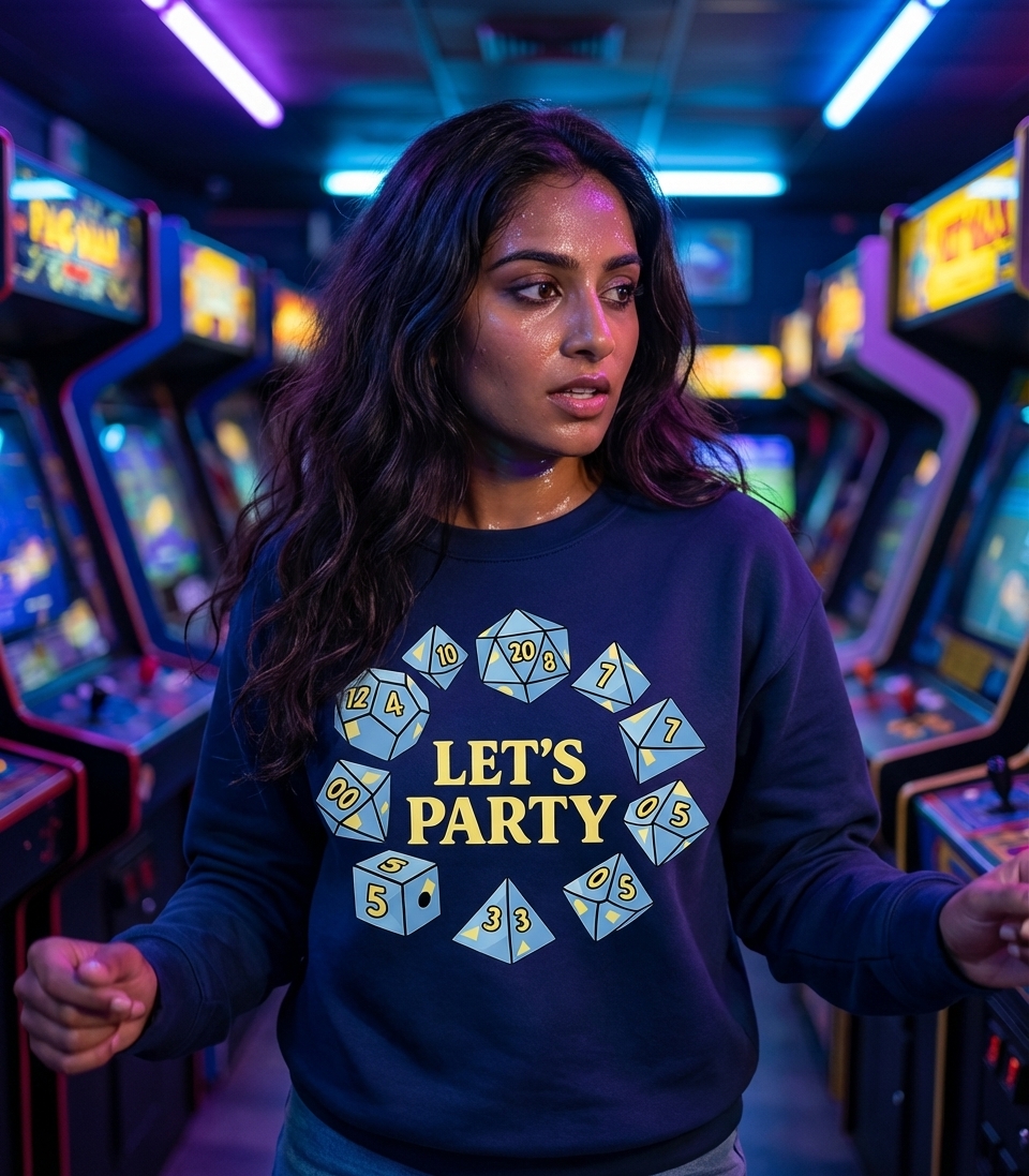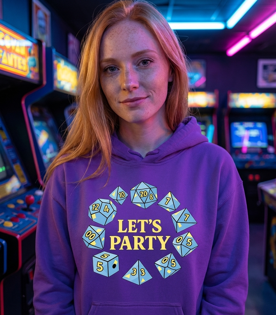 The 'Let's Party' phrase, surrounded by iconic polyhedral dice, captures the lifestyle of passionate tabletop gamers who spend their days rolling critical hits, adventuring with friends, and celebrating epic wins.
