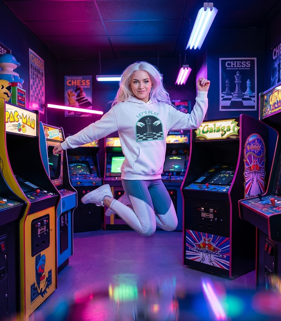 This striking artwork features a stylized chess queen, standing prominently on a classic checkered board. Two hands reach from the sides, signaling the start of a game and the challenge ahead.
