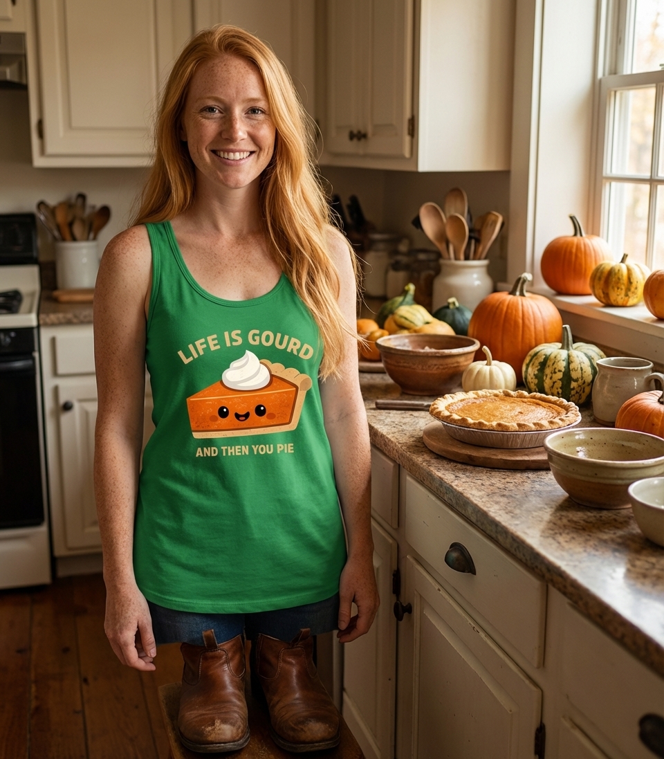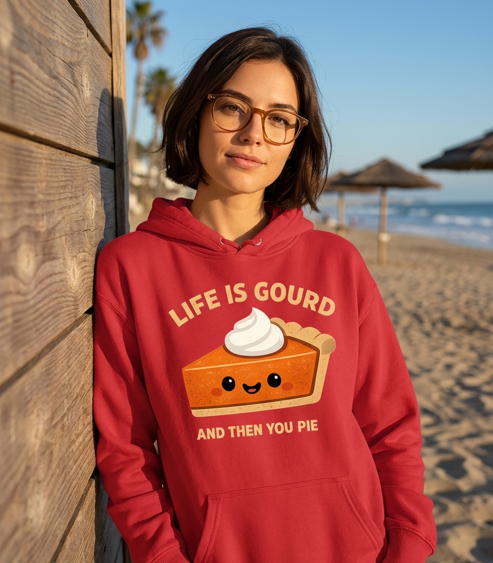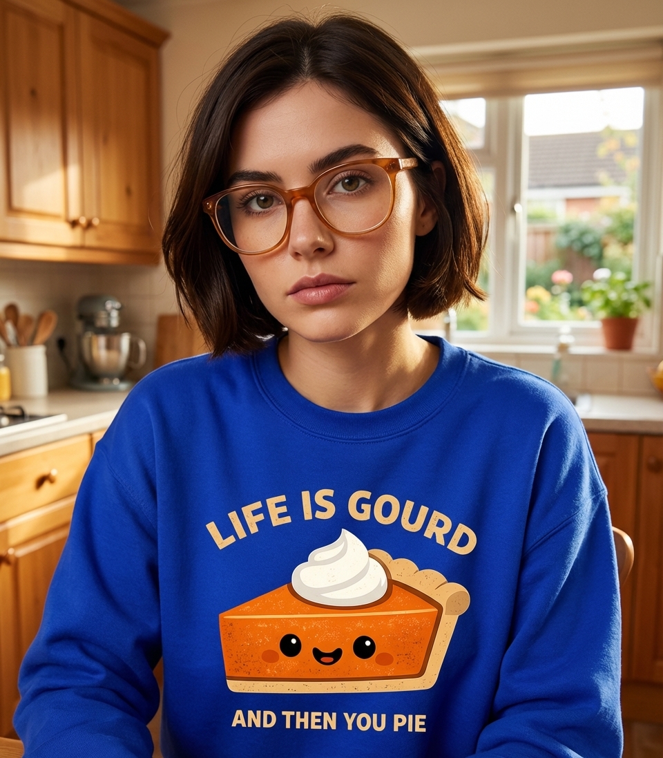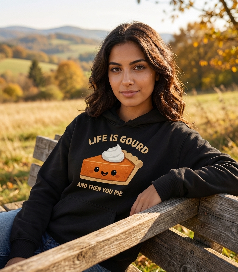 The 'Life Is Gourd And Then You Pie' phrase captures the lifestyle of witty food lovers who appreciate clever wordplay, autumn flavors, and a touch of lighthearted existential humor.