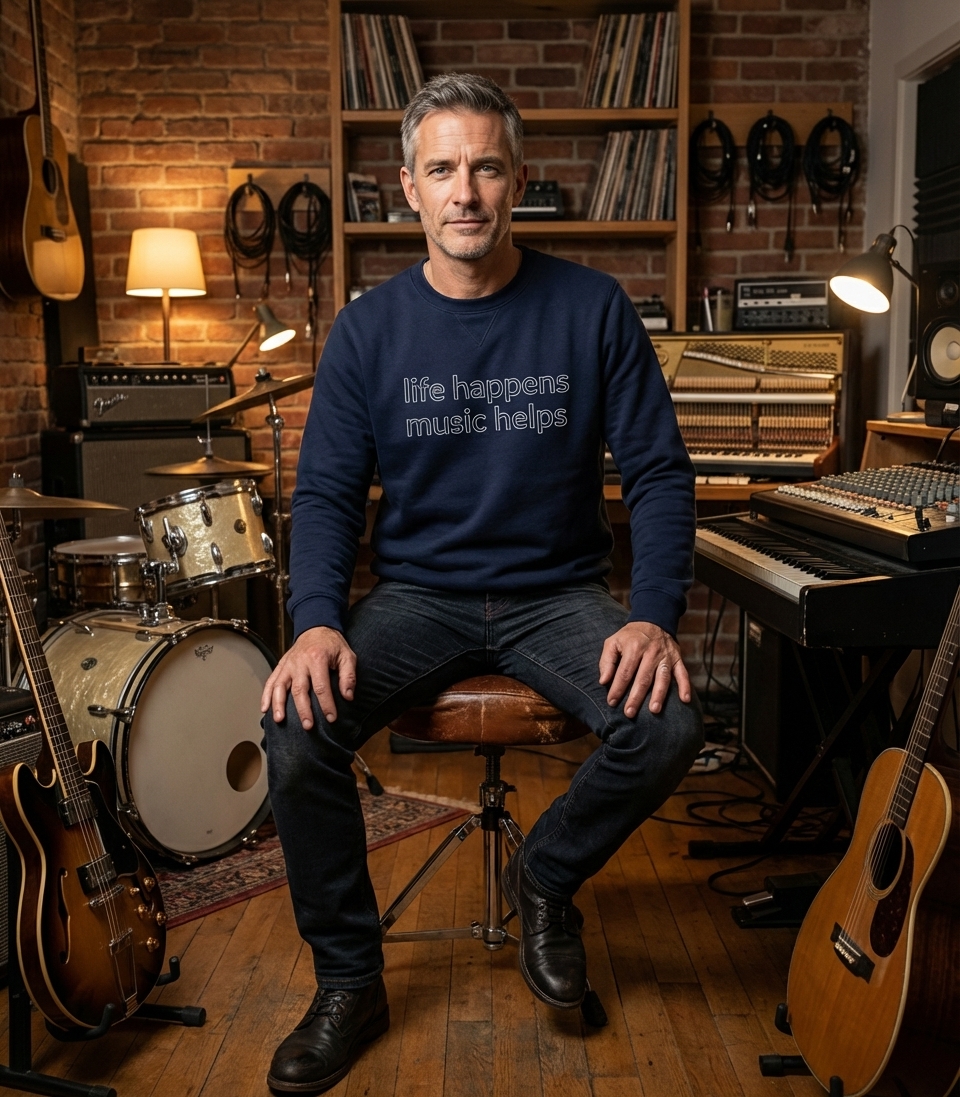 The 'Life Happens Music Helps' phrase captures the lifestyle of music lovers who find solace, joy, and motivation in melodies, lyrics, and rhythms.