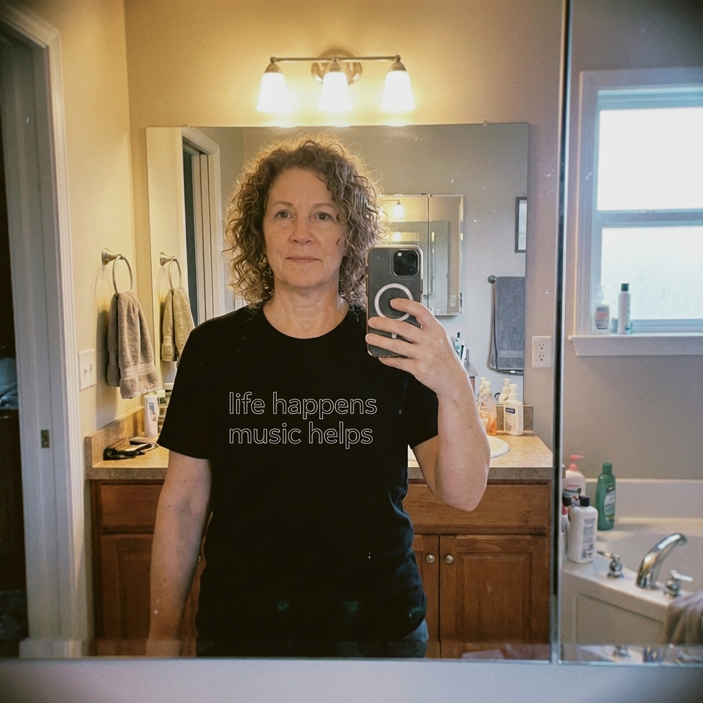 Okay, this tee is legit my new favorite. The 'life happens music helps' design totally speaks to me, and it's actually really soft. great purchase, tbh.