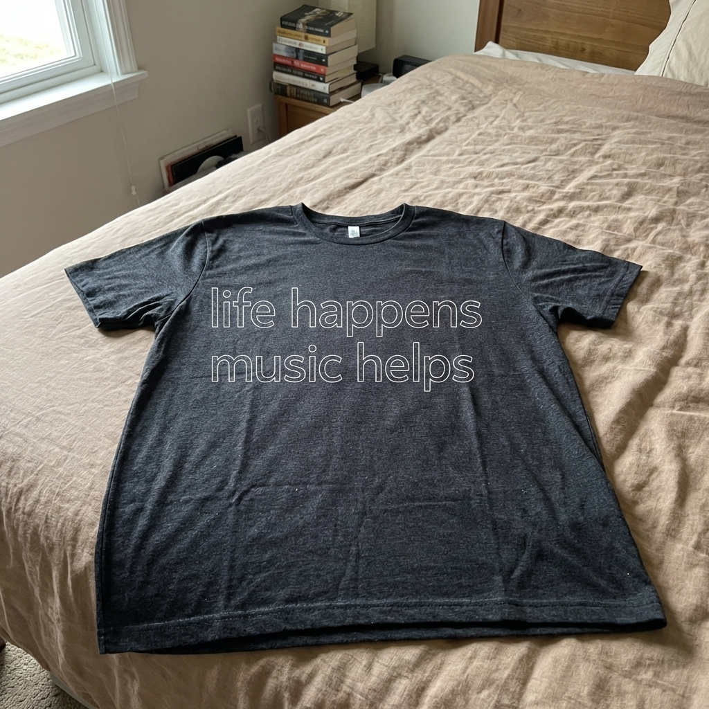 Okay so this tee is actually really nice. The 'Life Happens Music Helps' design totally resonates, and it's super comfy – definitely a new favorite for just chilling out.