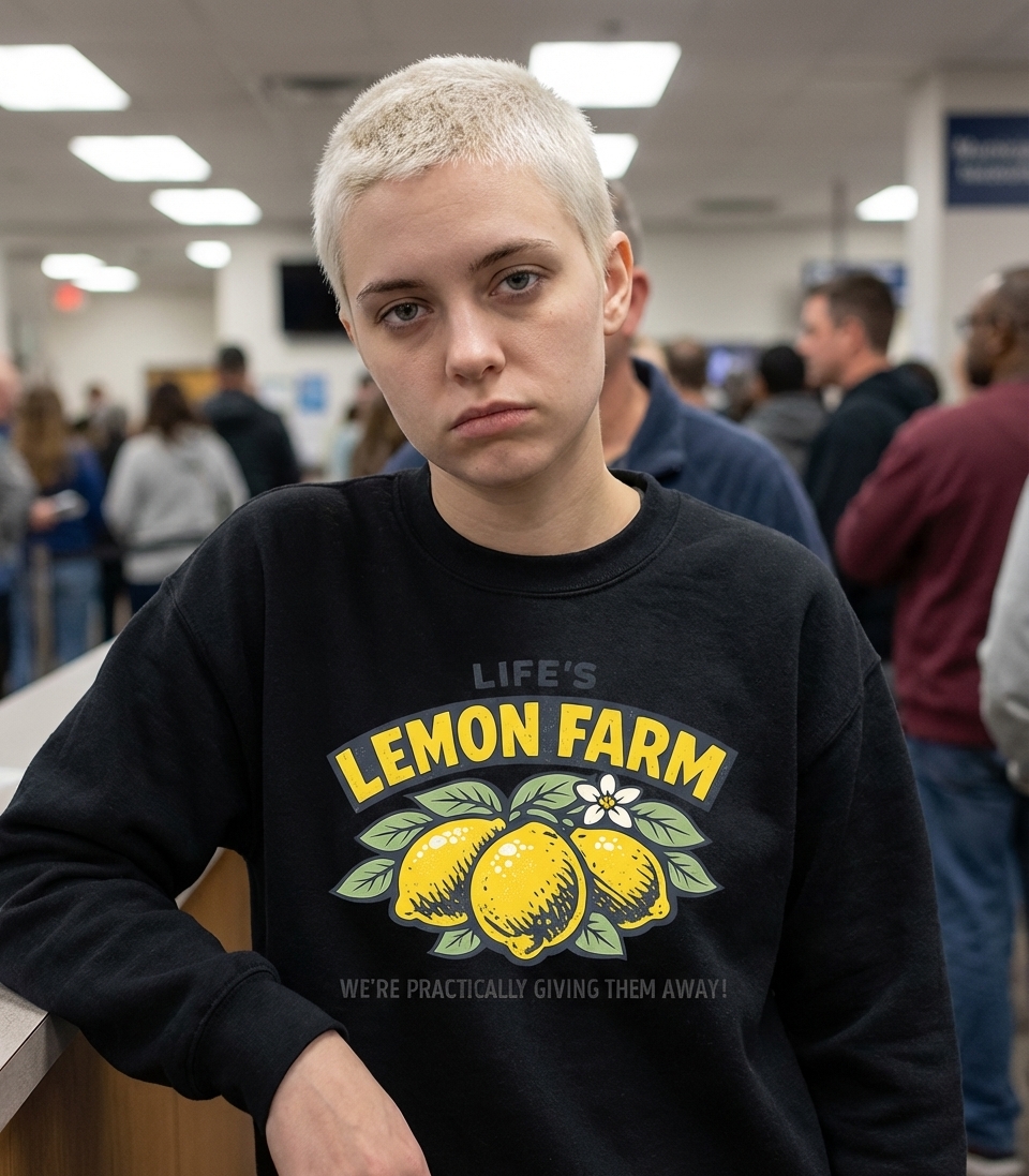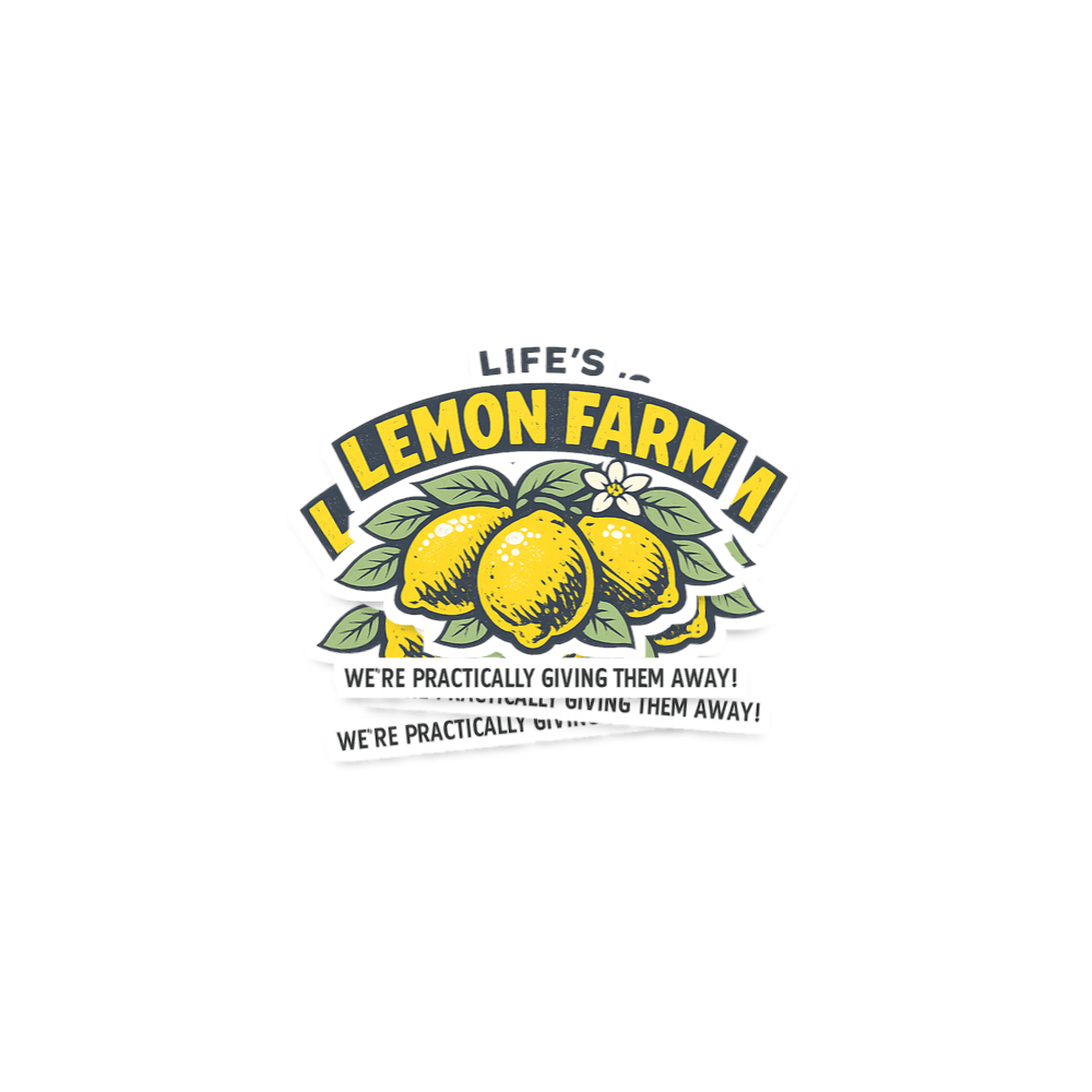 The phrase "Life's Lemon Farm, We're Practically Giving Them Away!" is a humorous twist on the well-known idiom "When life gives you lemons, make lemonade." It sarcastically suggests that life provides an overwhelming abundance of challenges and difficulties, almost as if they are being offered for free. This design resonates with those who use wit and sarcasm to cope with everyday frustrations.