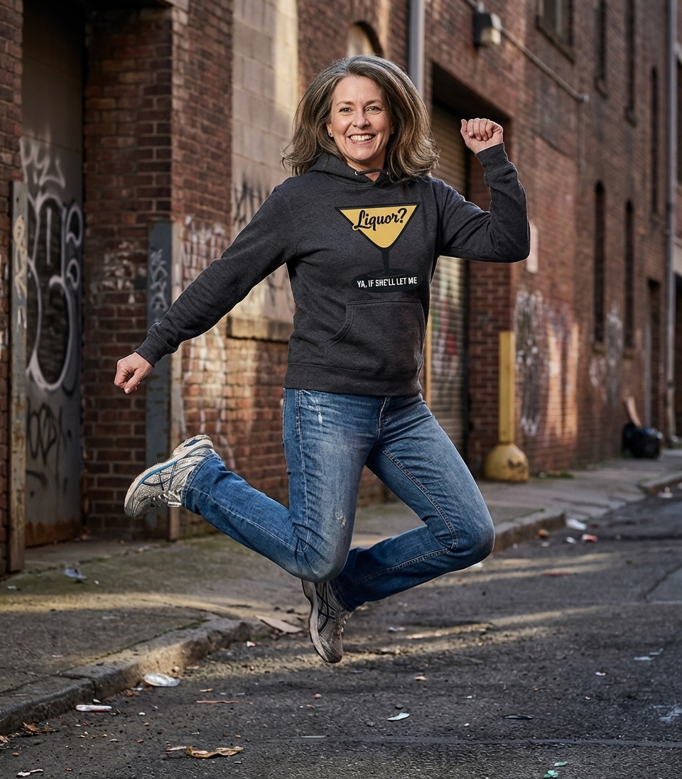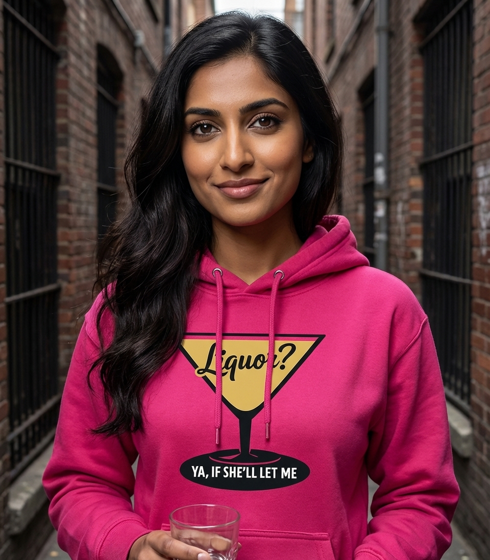 This design features a classic martini glass with the question "Liquor?" posed within its golden liquid. Below, a witty response "YA, IF SHE'LL LET ME" adds a layer of relatable relationship humor. It's a lighthearted take on common household dynamics.