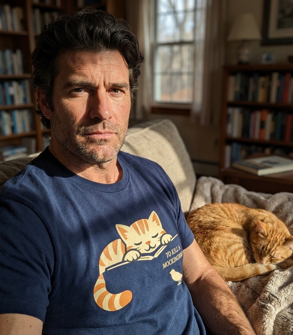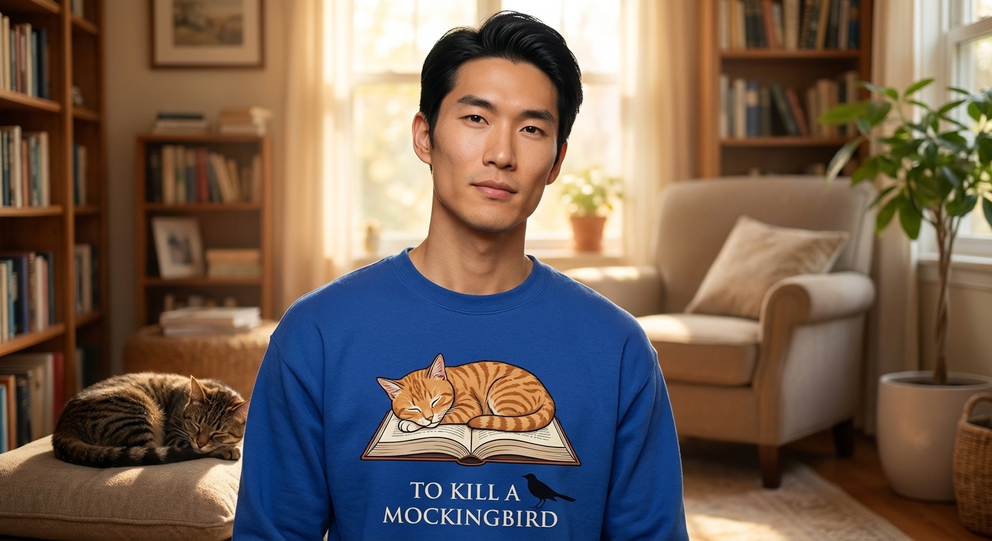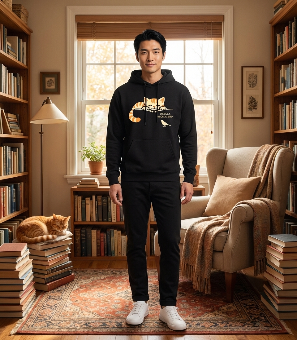 This heartwarming design showcases a contented, striped cat taking a peaceful nap on an open book. A small mockingbird stands attentively nearby, completing the clever visual reference to a beloved work of literature.