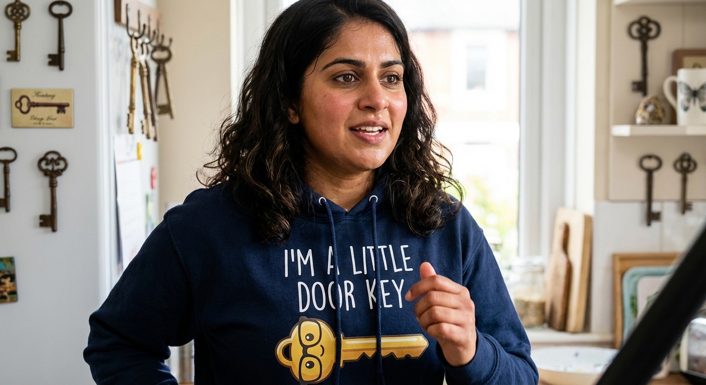 The phrase "I'm a Little Door Key" is a humorous parody of the well-known nursery rhyme "I'm a Little Teapot." It plays on the familiar melody and structure, substituting "teapot" with "door key" to create an unexpected and amusing pun.