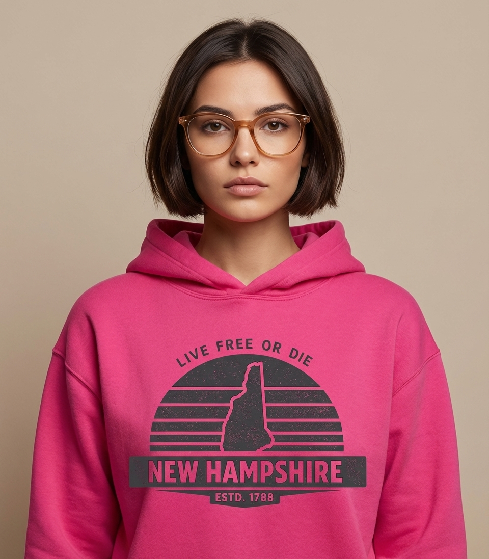 The phrase "Live Free or Die" is the official motto of New Hampshire, embodying the state's deep-rooted commitment to liberty and independence. "ESTD. 1788" refers to the year New Hampshire became the 9th state to ratify the U.S. Constitution, highlighting its significant place in American history.