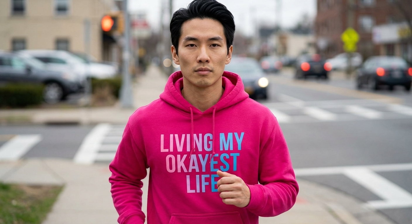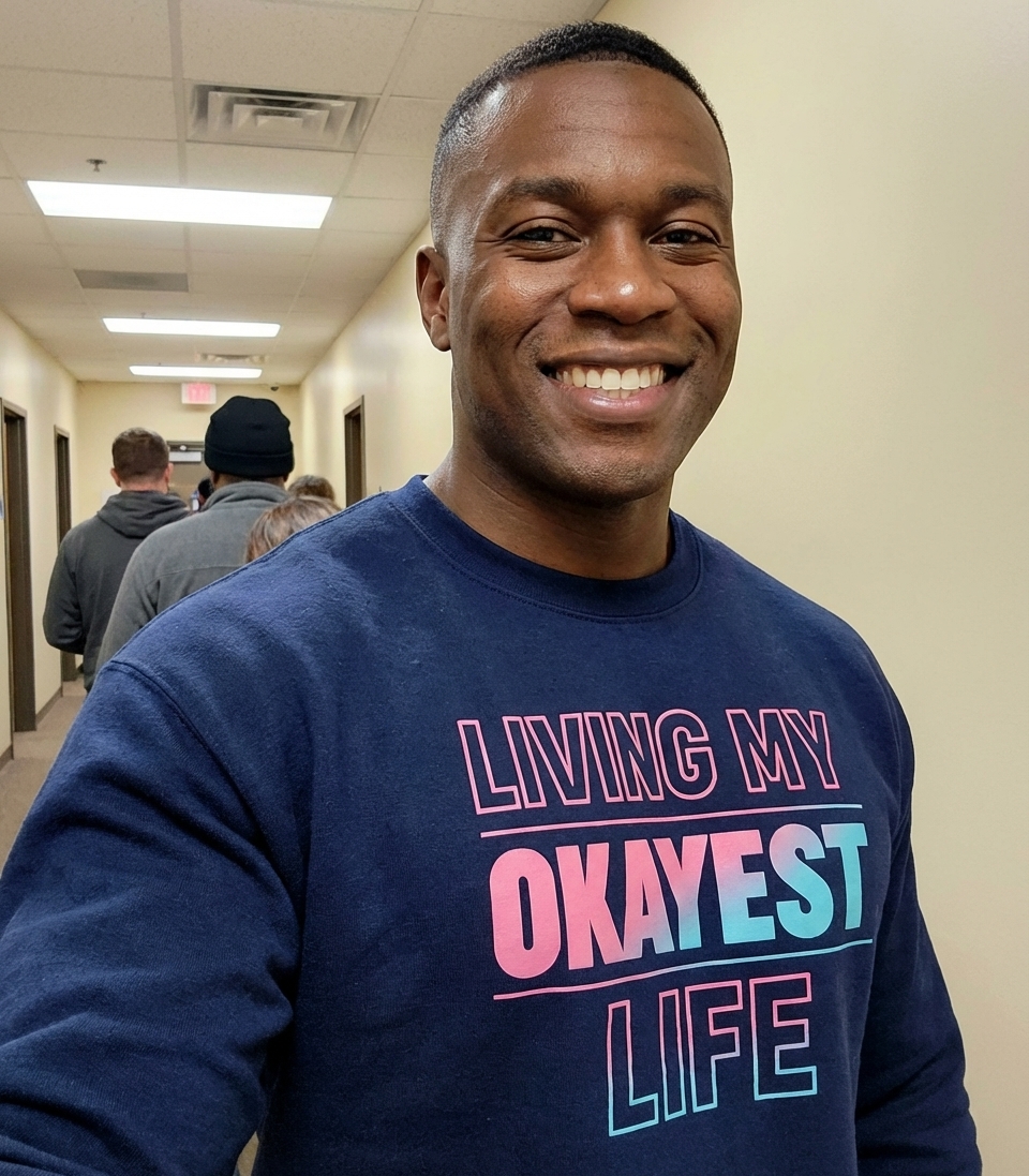 The "Living My Okayest Life" phrase captures the lifestyle of individuals who humorously embrace their current state, navigating daily challenges with a lighthearted, self-aware perspective.