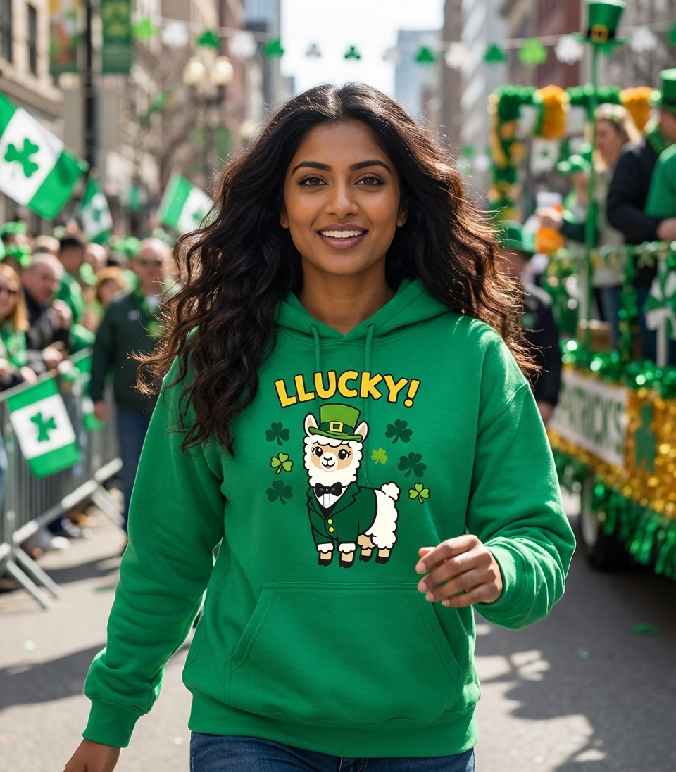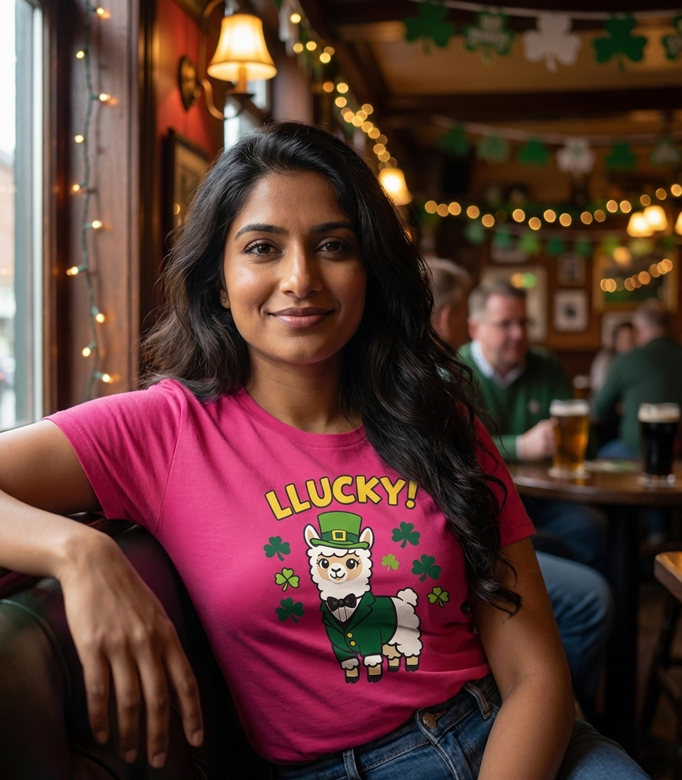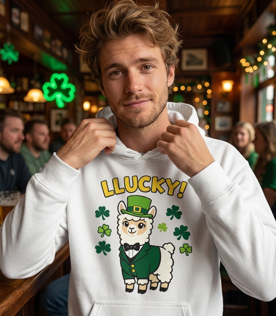 The "LLUCKY!" phrase captures the festive spirit of St. Patrick's Day enthusiasts who love charming animal puns, celebrating Irish culture, and embracing a bit of whimsical luck.