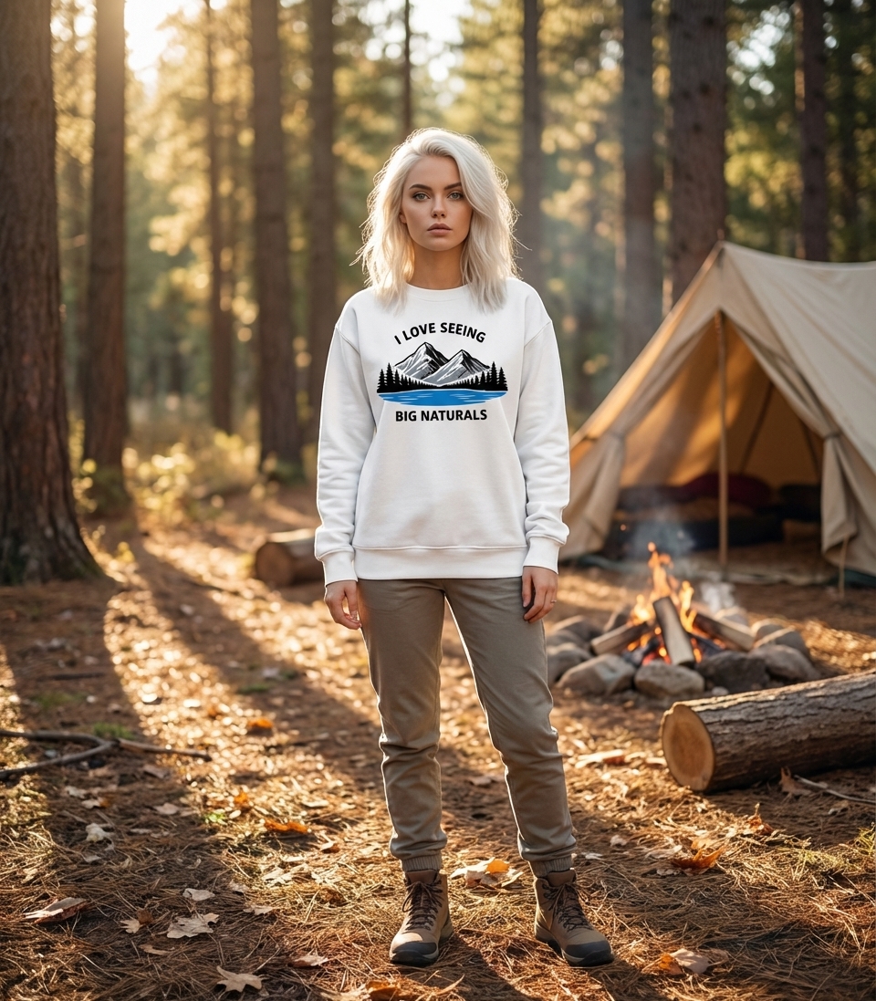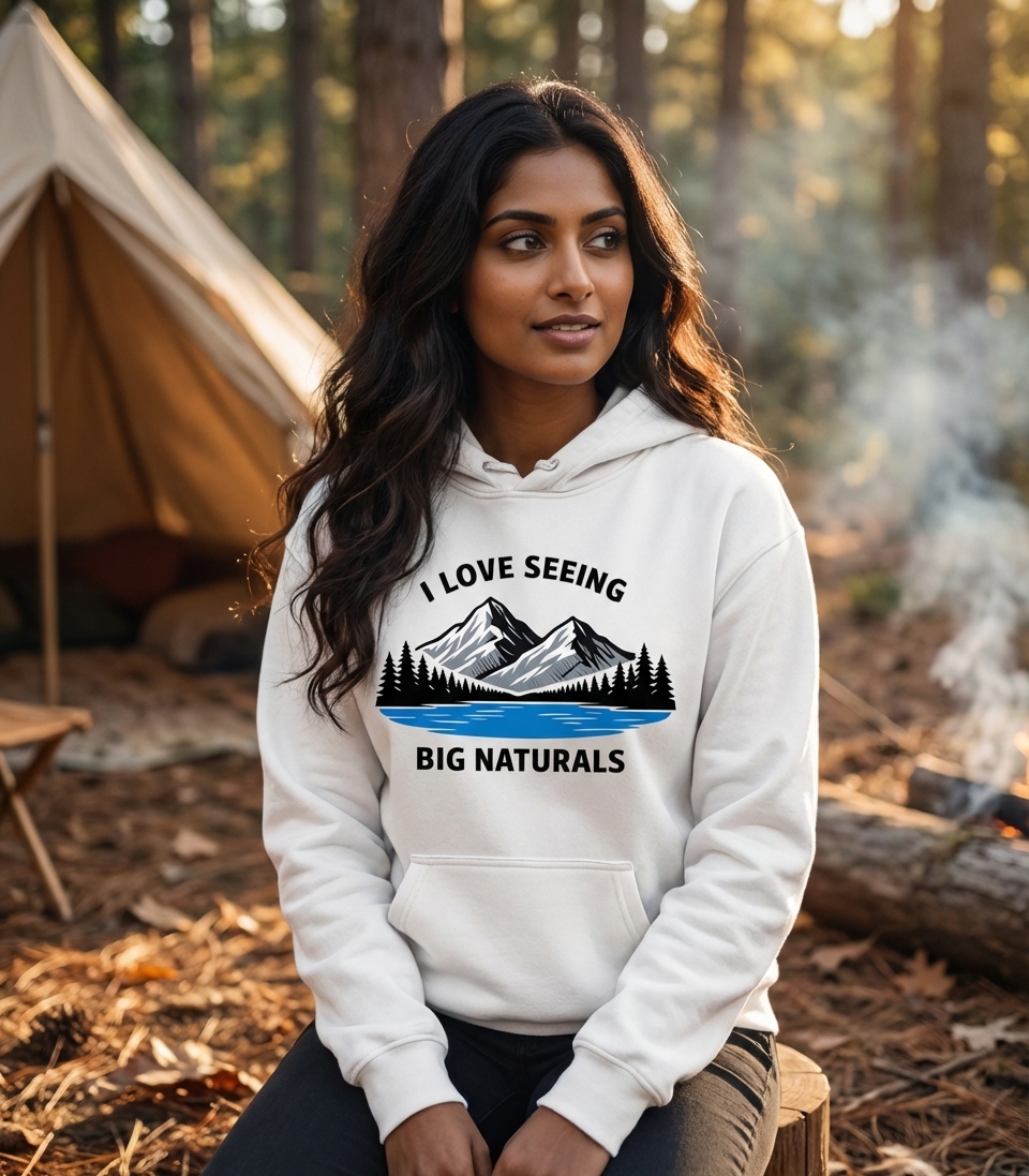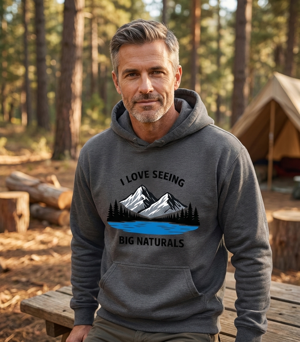 The 'I Love Seeing Big Naturals' phrase captures the lifestyle of passionate outdoor enthusiasts who spend their days exploring mountains, enjoying lakes, and appreciating scenic vistas.
