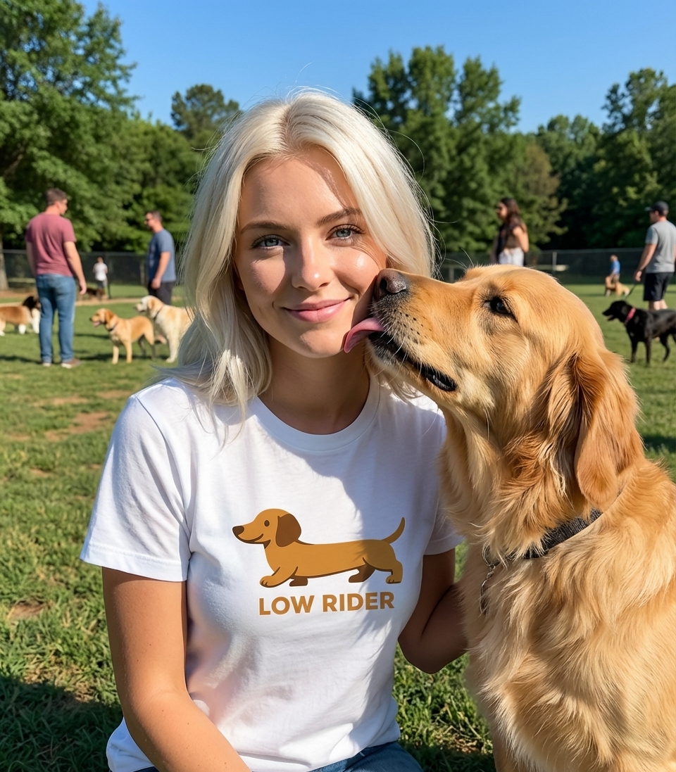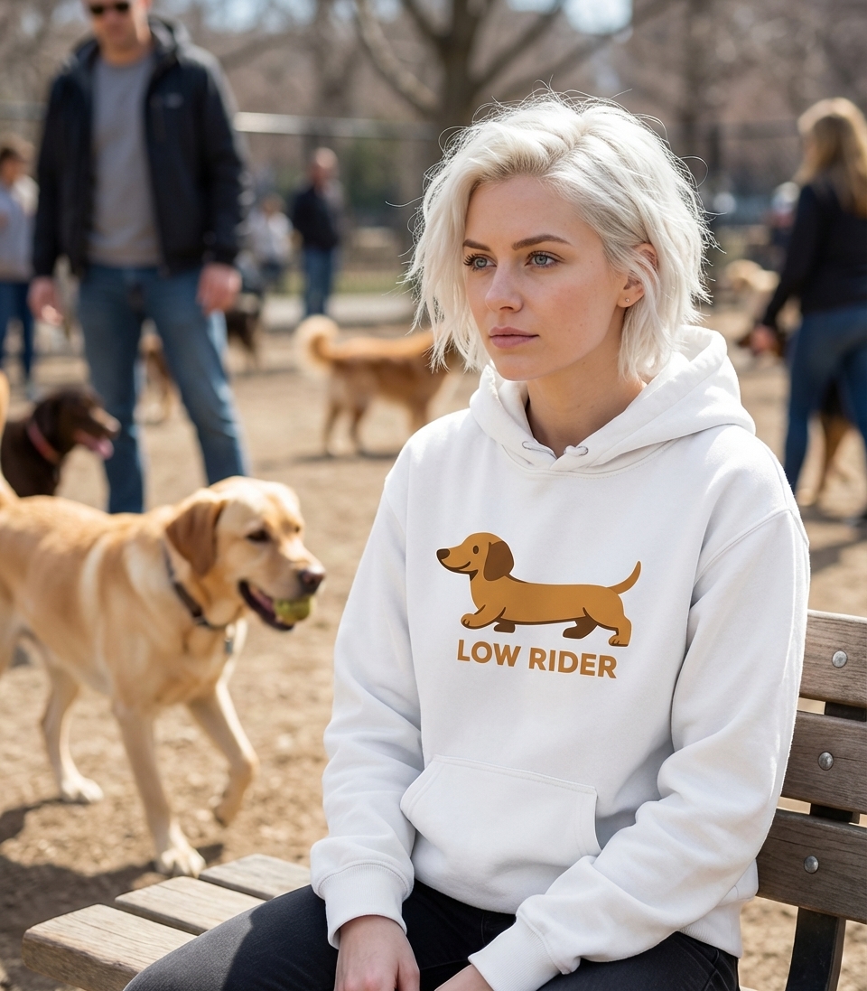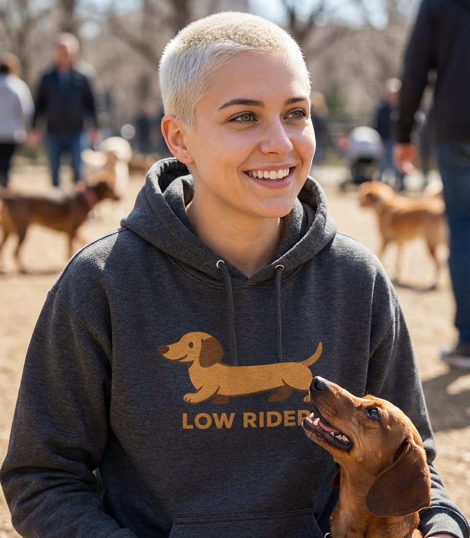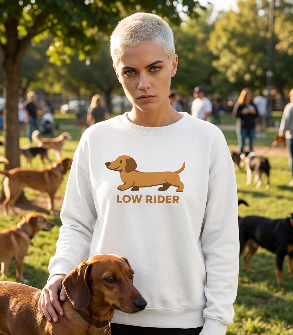 The phrase "Low Rider" is a clever pun that plays on two concepts. Firstly, it refers to the dachshund's naturally low-to-the-ground stature, a defining characteristic of the breed.