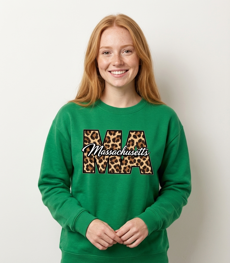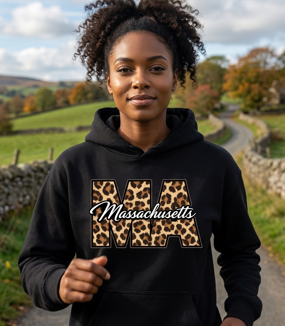 "MA" is the common abbreviation for Massachusetts, a state known for its rich history, vibrant culture, and passionate residents. This design combines the official state name with a trendy animal print, symbolizing both pride in heritage and a flair for contemporary fashion.