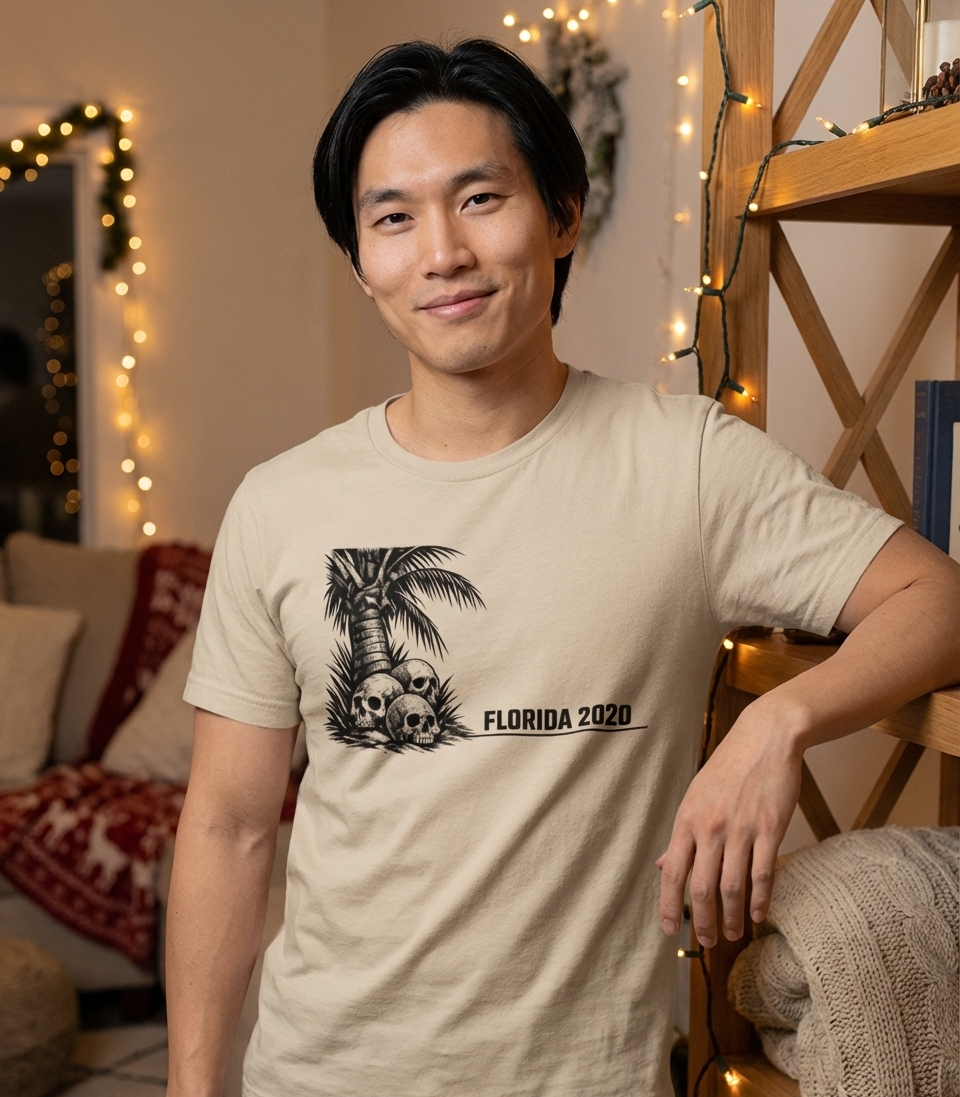 This striking graphic features a stylized, skeletal tree trunk, reminiscent of an ancient totem or a dying palm. At its base, three intricately detailed human skulls are piled, creating a powerful and ominous visual.