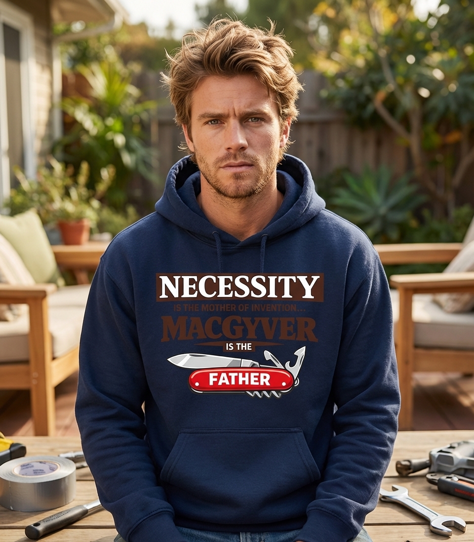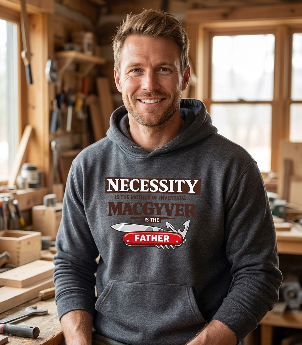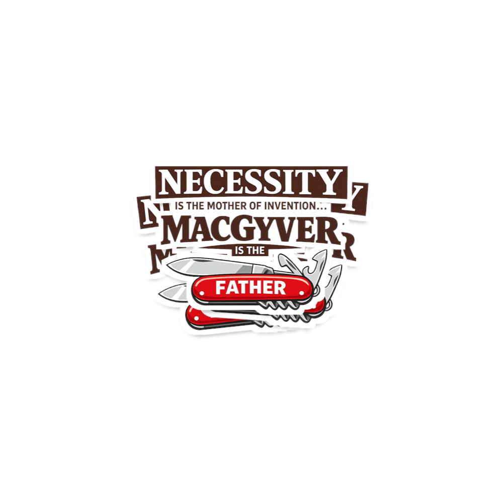 The saying "Necessity is the Mother of Invention" highlights how difficult situations often lead to creative solutions. Adding "MacGyver is the Father" playfully credits the iconic television character, known for using everyday items to escape impossible predicaments. It’s a nod to those who can fix anything with what they have at hand.