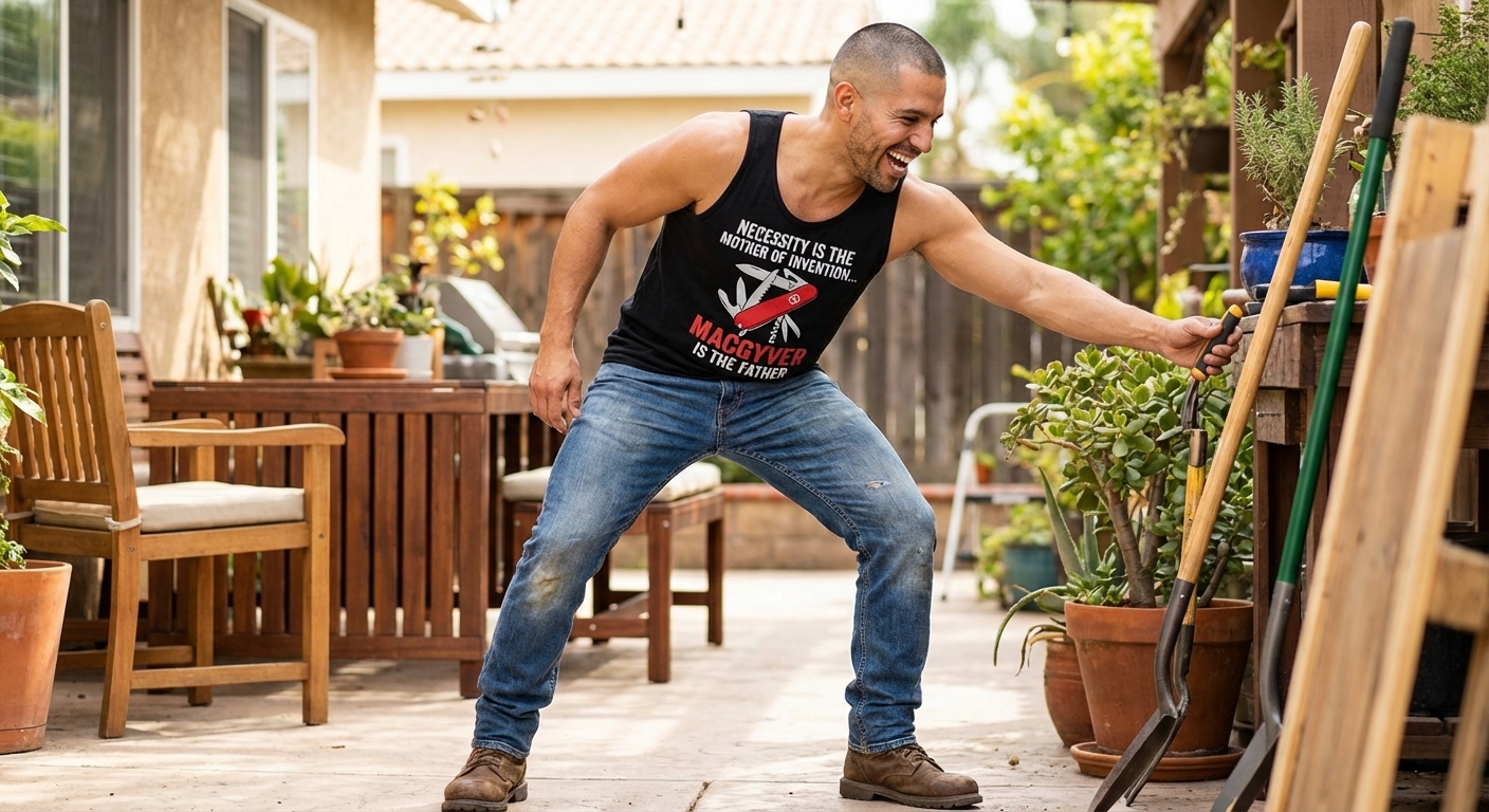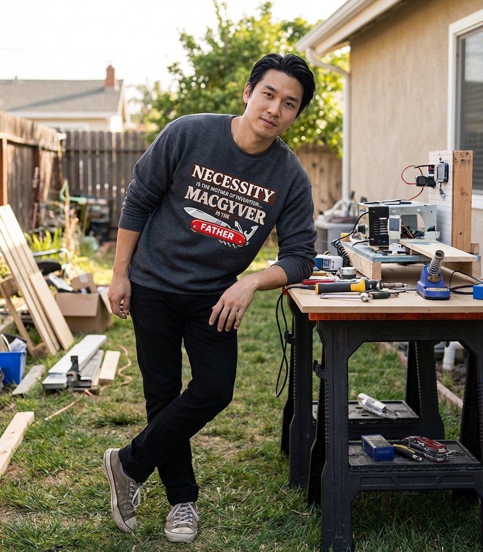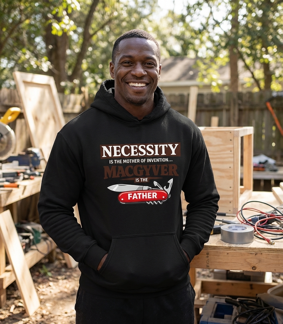 The saying "Necessity is the Mother of Invention" highlights how difficult situations often lead to creative solutions. Adding "MacGyver is the Father" playfully credits the iconic television character, known for using everyday items to escape impossible predicaments. It’s a nod to those who can fix anything with what they have at hand.