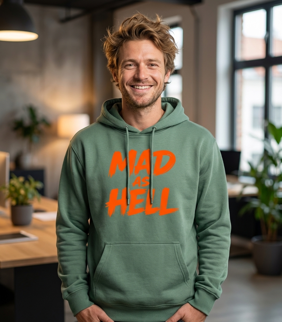 The artwork features the phrase 'MAD AS HELL' in a vibrant, distressed orange, brushstroke font set against a solid black background. This high-contrast color palette and gritty typography create an intense, rebellious, and unapologetic mood.