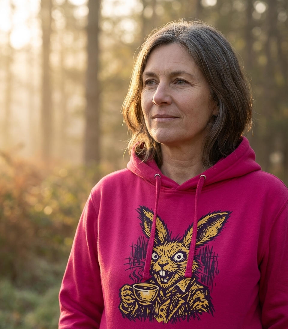 This edgy rabbit design captures the frantic energy of coffee enthusiasts who leap into their day with wide-eyed determination.