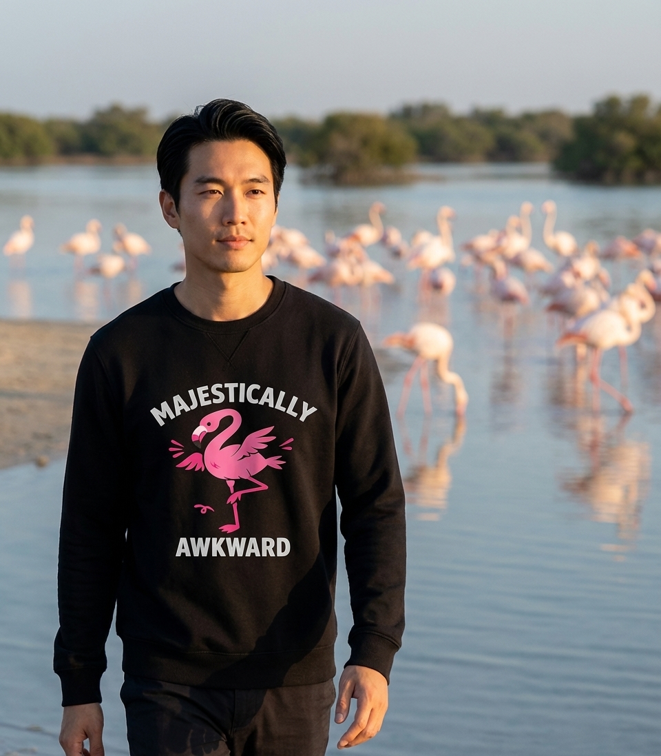 This playful graphic features a vibrant pink flamingo striking an unconventional pose, embodying a blend of elegance and endearing clumsiness. The design highlights the beauty in imperfections, making it a relatable statement piece.