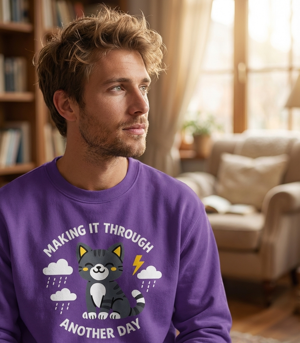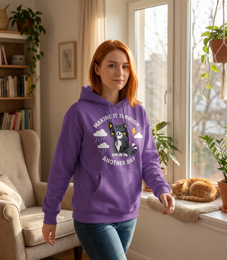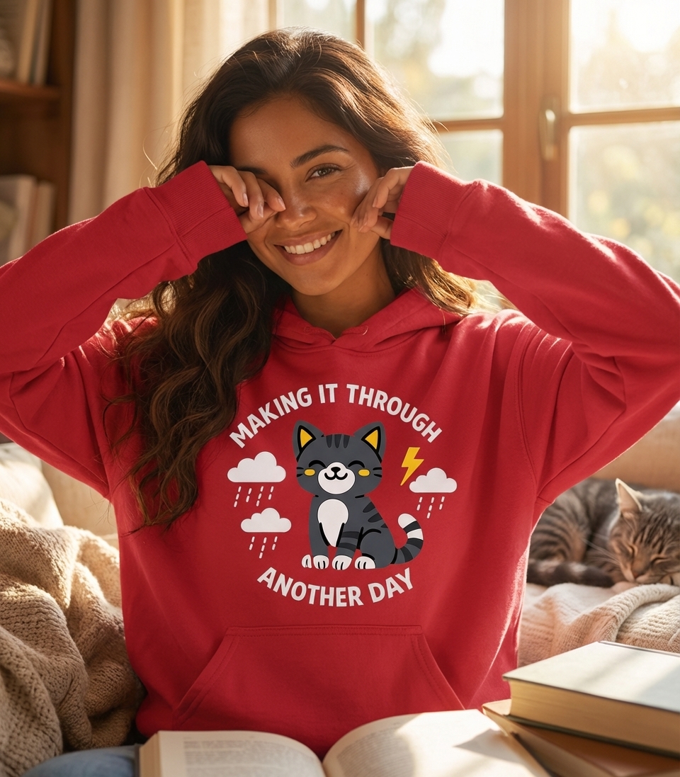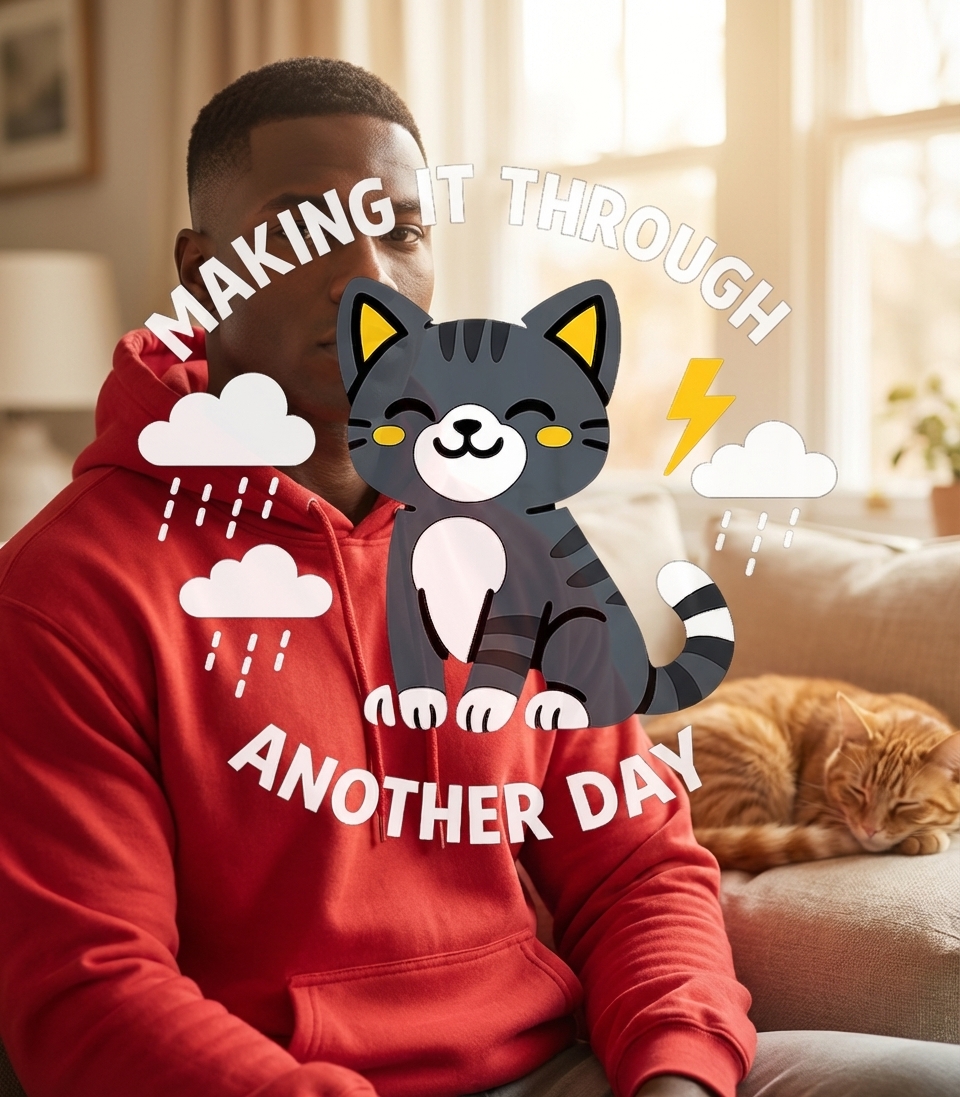 The 'Making It Through Another Day' phrase captures the comforting spirit of cat lovers who navigate daily challenges with resilience and a smile, much like their feline companions.